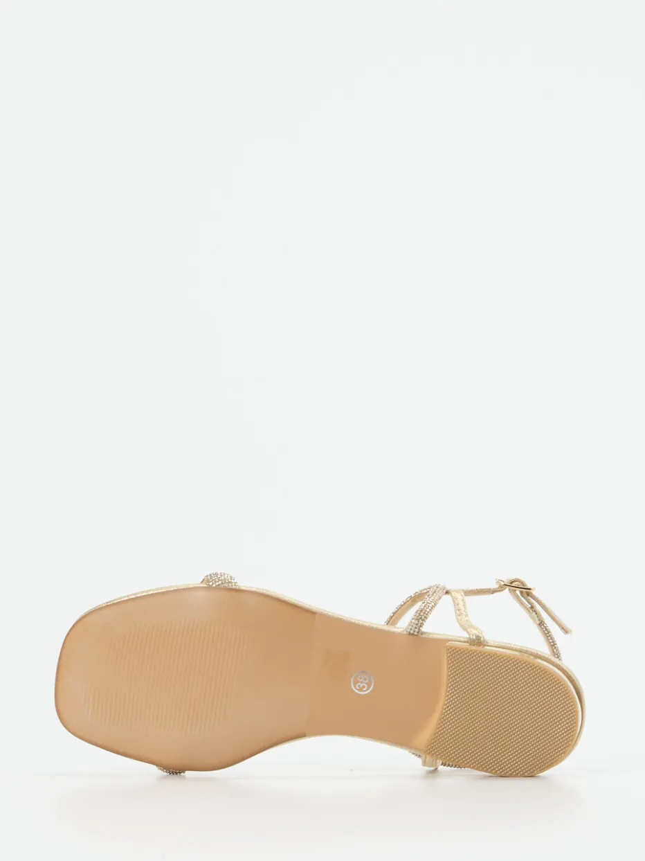 Ob bei einer eleganten Sommerhochzeit oder einem besonderen Abend-Event: Das schimmernde Metallicleder in edlem Goldton und die feinen Riemchen mit Strassbesatz setzen luxuriöse Akzente. Die filigrane Silhouette mit verstellbarem Knöchelriemen und flachem Metallic-Absatz bietet Komfort und sicheren Halt. Der dezente Glanz und die klaren Linien spiegeln den Trend zu „Quiet Luxury“ und aktuellen Metallic-Akzenten wider. Kombiniert mit Abendkleidern in Nude-Tönen entsteht ein harmonisches Gesamtbild.