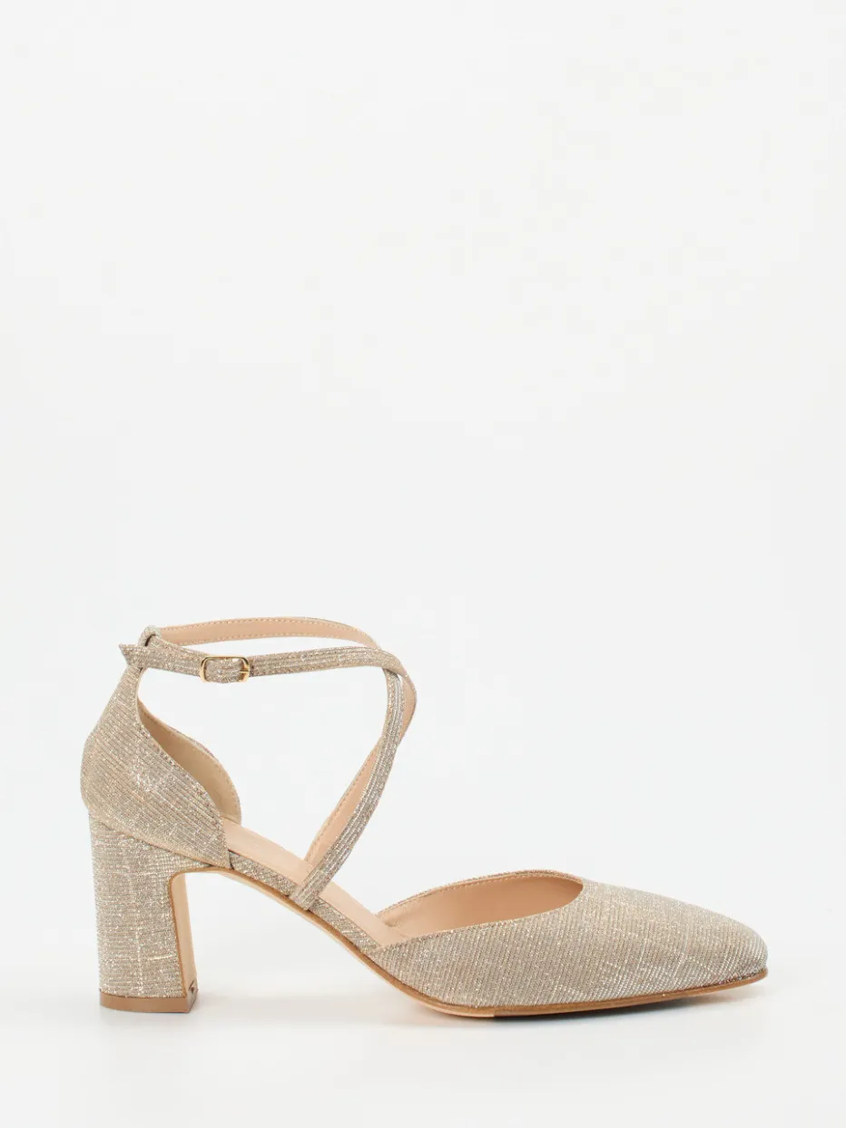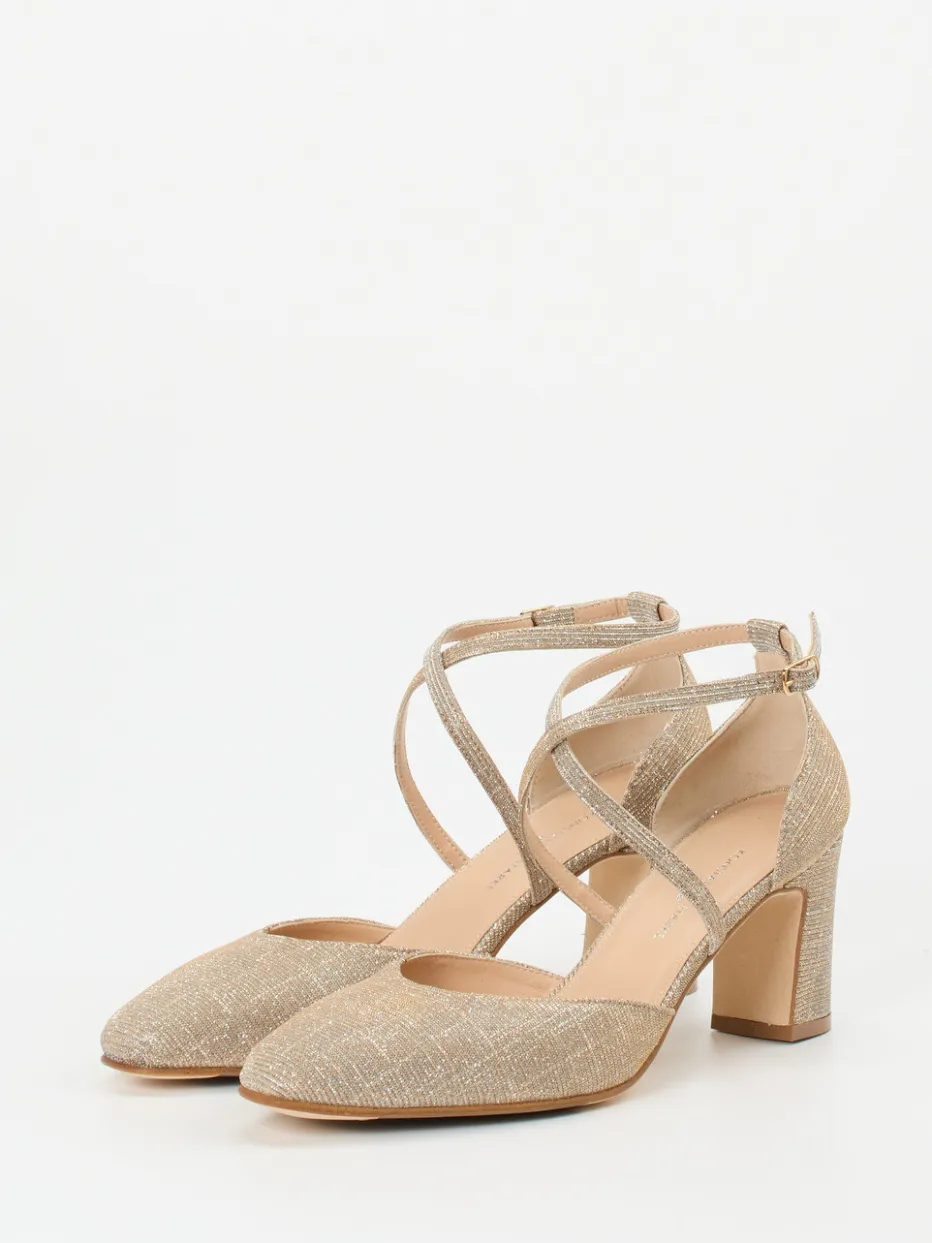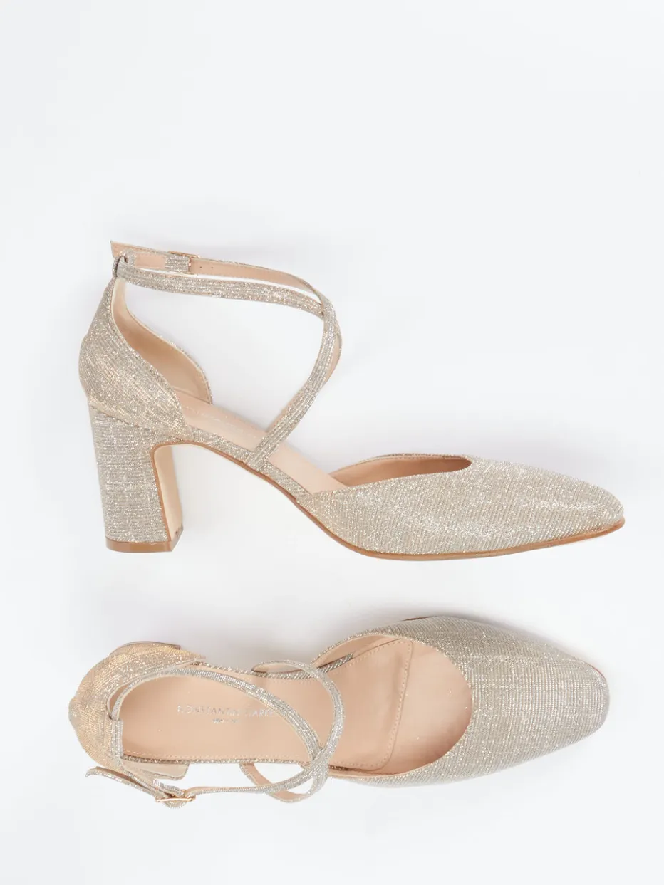 Die funkelnde Oberfläche in Champagner-Gold und die überkreuzten Riemen verleihen diesem Modell eine besonders elegante Ausstrahlung – perfekt für stilvolle Abendveranstaltungen.