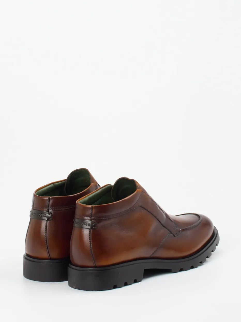 Stilvoll durch Herbst und Winter.Galizio Torresi präsentiert mit diesem Ankle Boot ein hochwertiges Modell für Herren. Ideal für den Alltag im Büro oder stilvolle Freizeitmomente: Das cognacbraune Kalbleder zeigt sich dezent glänzend und wird durch tonal abgestimmte Nähte dezent strukturiert. Die geschlossene Silhouette sitzt bequem am Fuß, der Einstieg erfolgt unkompliziert dank Schlupfform mit rückseitiger Zuglasche. Innen sorgt grün gefärbtes Kalbleder für Komfort, während die robuste Profilsohle zuverlässige Trittsicherheit bietet. Inspiriert von Quiet Luxury und Modern Classic-Trends, passt der Schuh hervorragend zu Wollmantel und Stoffhose. Ein durchdachtes Design mit maskuliner Eleganz – gefertigt für anspruchsvolle Looks.