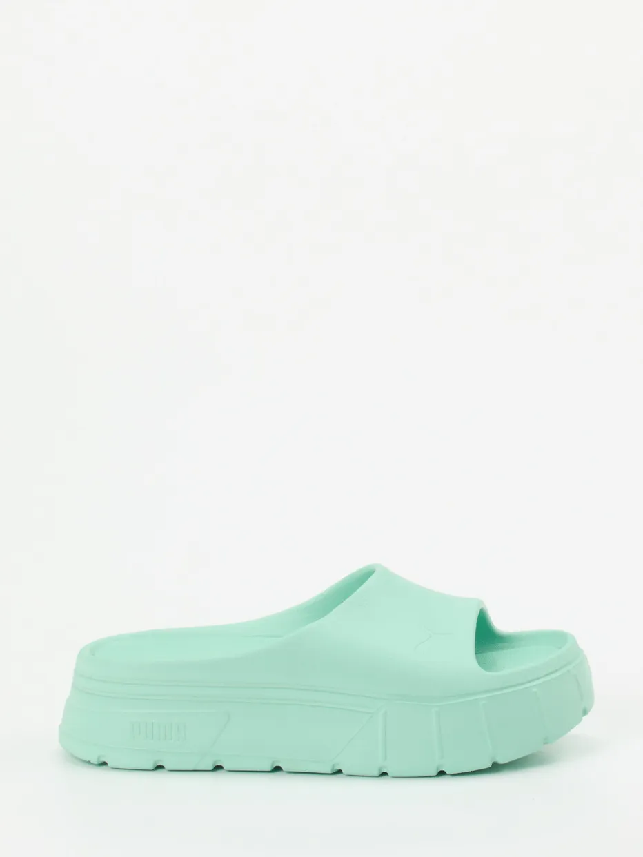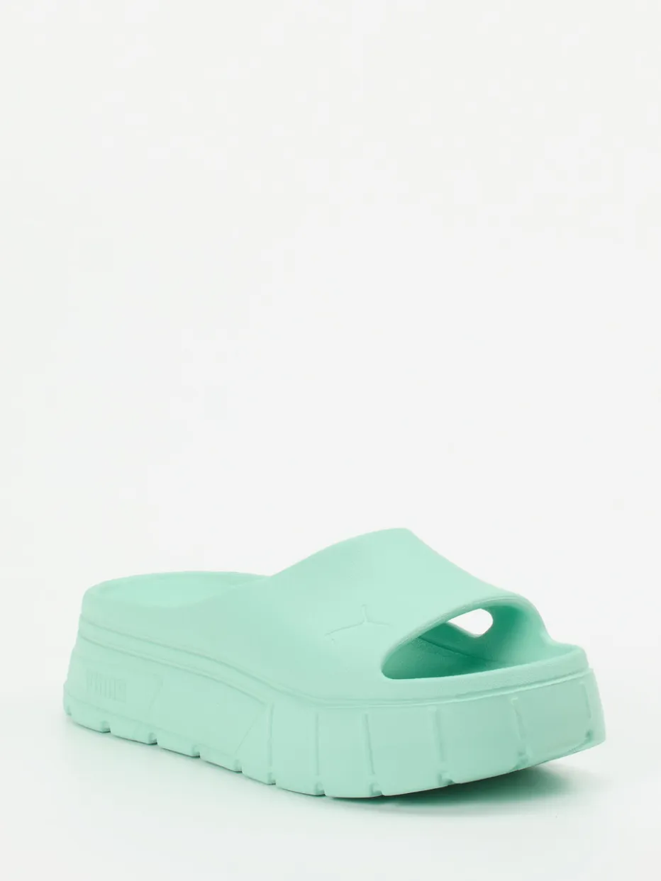 Chunky-Sommerstil neu gedacht.Puma präsentiert eine Badepantolette für Damen und Herren, inspiriert vom ikonischen Mayze-Sneaker. Ideal für entspannte Sommertage: Das Modell kombiniert leichtes, wasserresistentes Gummi mit einer matten Oberfläche und einem monochromen Mintgrün. Die durchgehende Plateau-Sohle im Chunky-Design, offene Zehenpartie sowie ein ergonomisch geformtes Fußbett bieten Komfort und visuelles Volumen – perfekt für Streetwear-Looks oder Poolside-Ästhetik. Die Ton-in-Ton-Logo-Prägung und minimalistische Silhouette betonen den zeitgemäßen Stil. Lässt sich mühelos mit Badebekleidung oder lässigen Freizeitoutfits kombinieren. Ein Style-Statement mit ultraleichtem Komfort und klarer Formensprache.