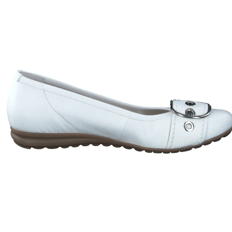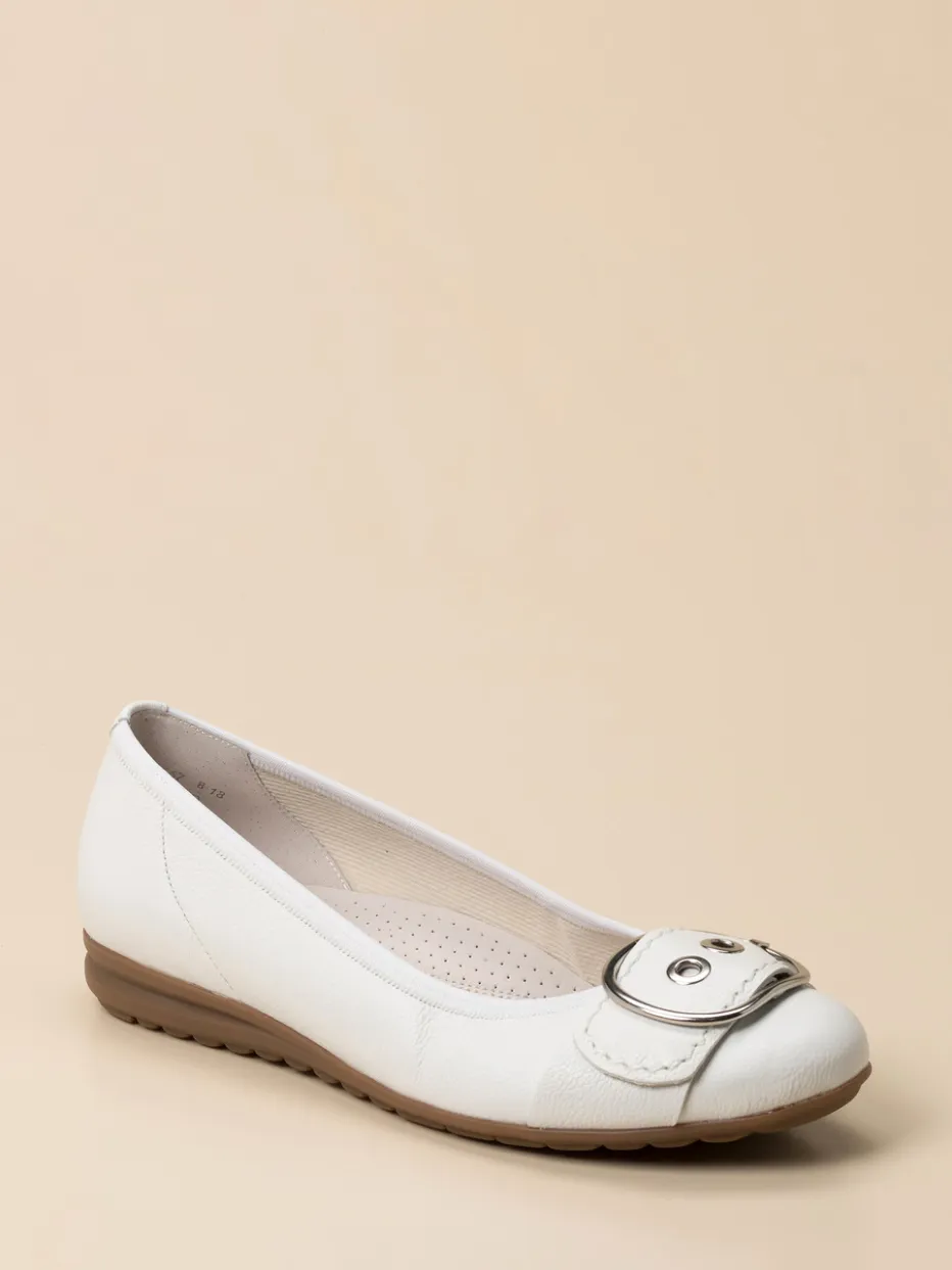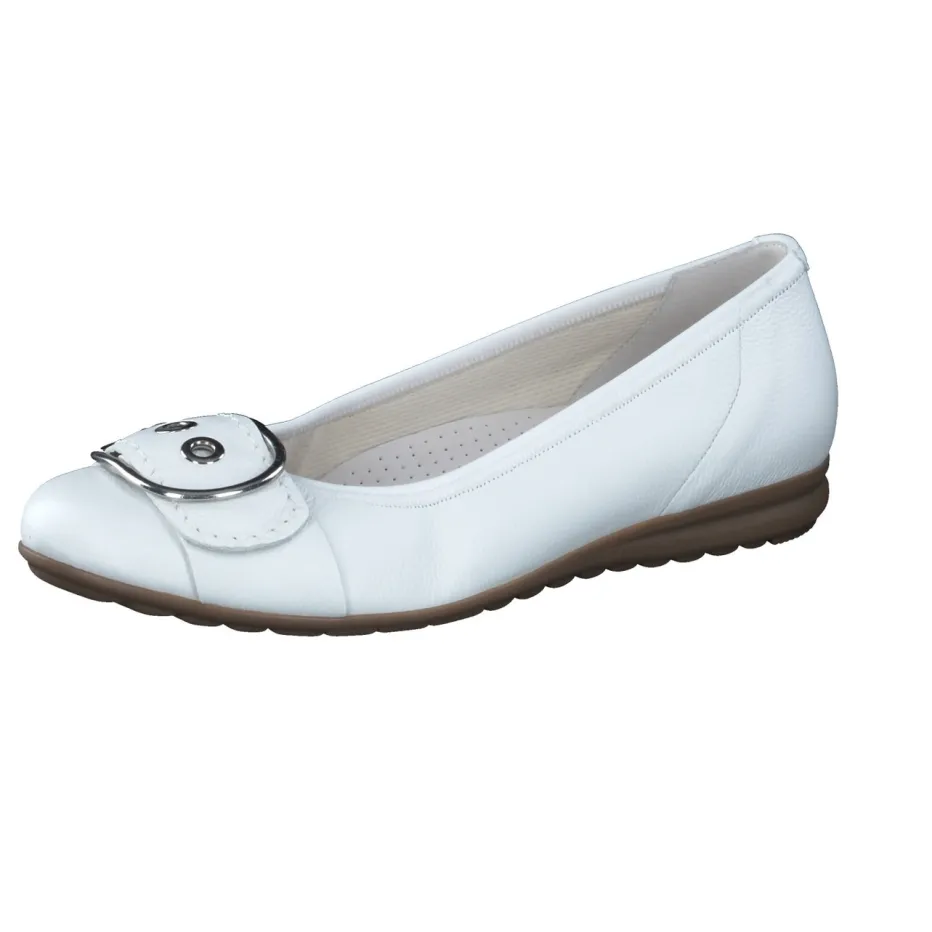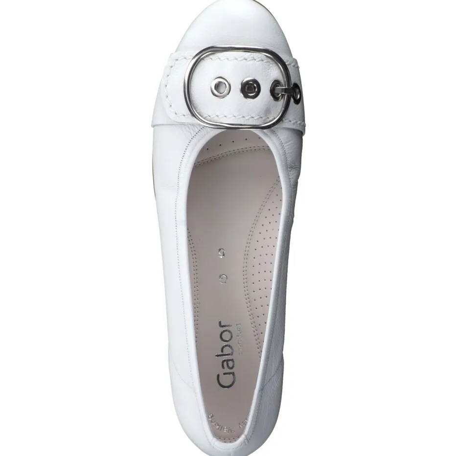 Komfort und Eleganz im Alltag.Der Damen-Ballerina von Gabor Comfort überzeugt als stilvolle Komfort-Schuhwahl. Ideal für Tage, an denen Bewegungsfreiheit und Seriosität gefragt sind: Weiches Kalbleder in Weiß mit genarbter Oberfläche bietet angenehme Flexibilität. Die flache, runde Form und ein toniger Elasteinfass sichern eine gute Passform. Akzente setzen eine silberfarbene Zierschnalle und eine profilierte Gummisohle mit Air-Cube-Technologie. Modisch im Geist von „Quiet Luxury“ und Casual Chic passt das Modell hervorragend zu beigem Trenchcoat oder weißer Handtasche. Erleben Sie die Verbindung aus klassischem Stil und durchdachtem Komfort, wie man es von Gabor Comfort kennt.