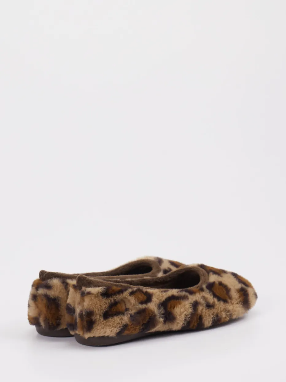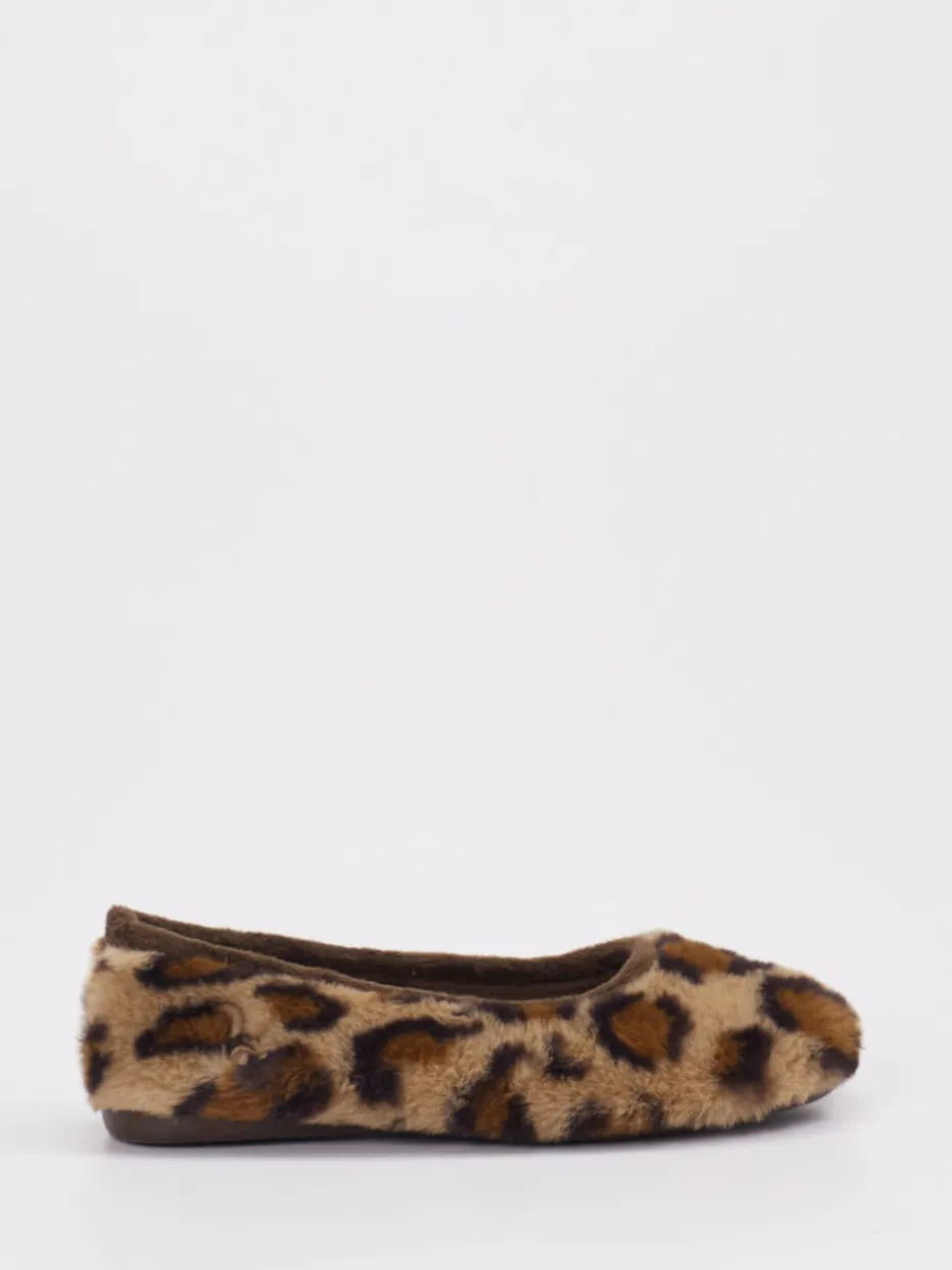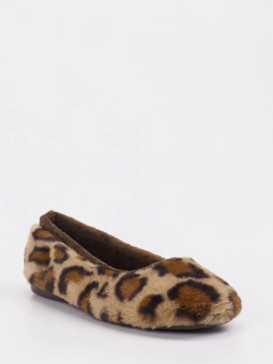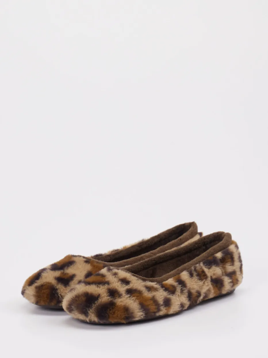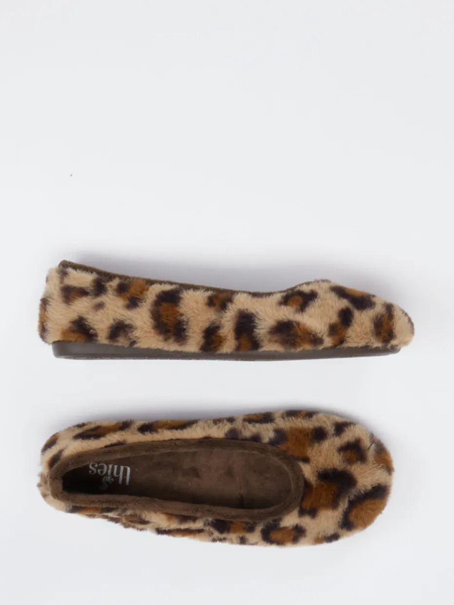 Stilvoll relaxen in Leo-Optik.Thies präsentiert mit diesem Damen-Ballerina-Hausschuh einen trendigen Begleiter für entspannte Stunden. Optimal für gemütliche Abende zu Hause bietet das Modell hohen Tragekomfort dank flauschigem Textilmaterial mit Kunstfell-Haptik. Der hellbraune Ton kombiniert sich mit einem zeitgemäßen Leomuster, das in Kombination mit der klassisch runden Silhouette für modisches Flair sorgt. Die weich gefütterte Innensohle und die rutschhemmende Gummisohle unterstützen ein angenehmes Laufgefühl. Ohne Verschluss lässt sich der Schuh unkompliziert in Schlupfform tragen – ideal zur cozy Loungewear oder zum Fleece-Hausanzug. Ein Hausschuh, der Komfort mit stilbewusster Wohlfühlästhetik vereint.