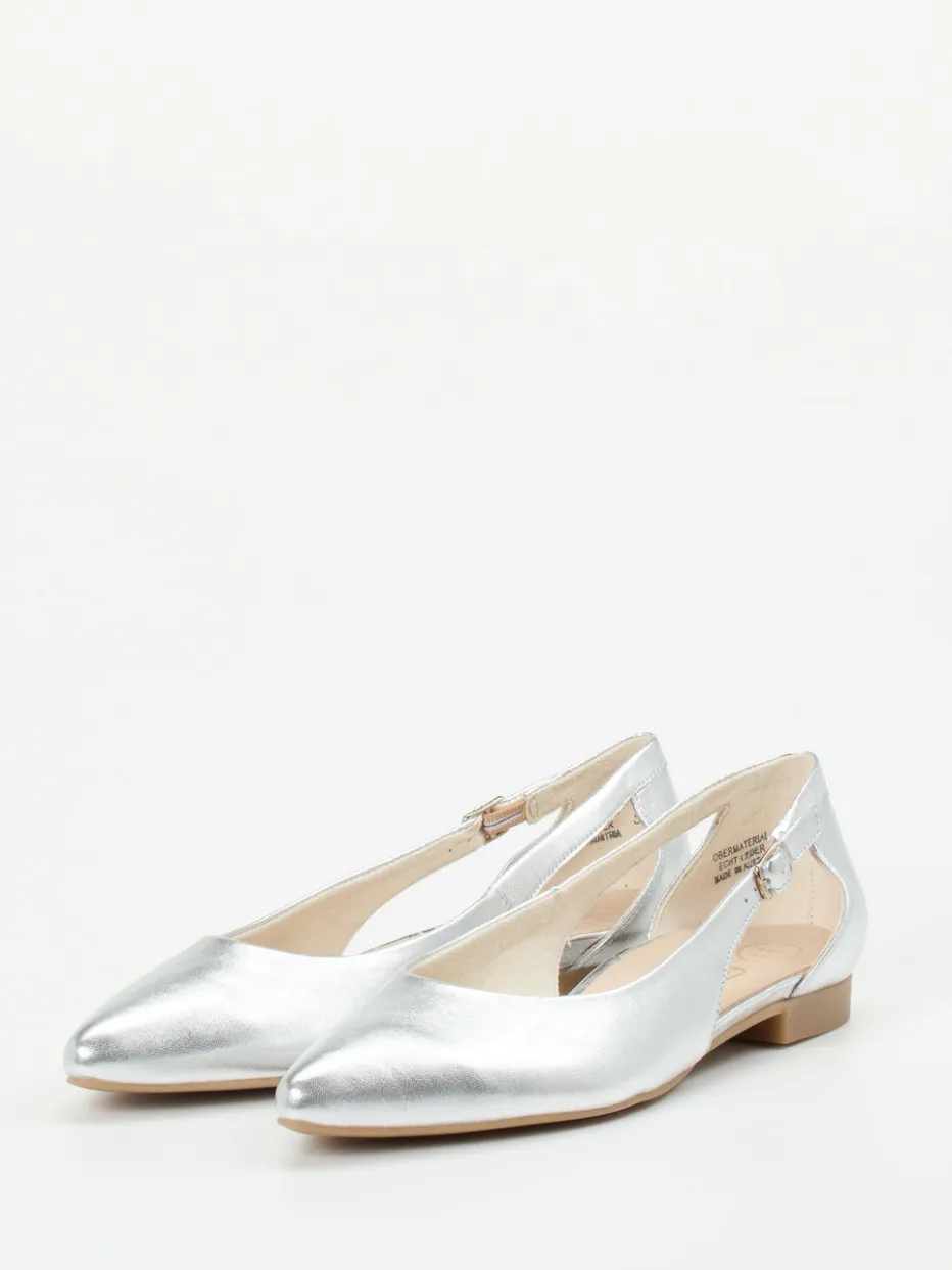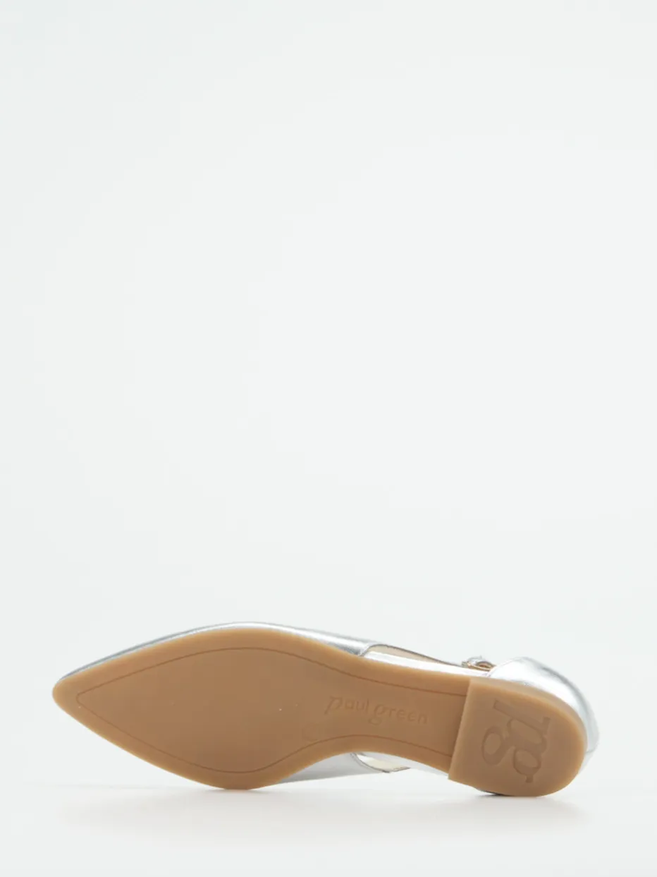 Eleganter Glanz für stilvolle Momente.Paul Green präsentiert mit diesem Damen-Ballerina ein minimalistisches Highlight für Alltag und Event. Das silberfarbene Kalbleder mit glänzender Oberfläche unterstreicht die moderne Linienführung des spitz zulaufenden Designs. Ein seitliches Cut-Out mit filigraner Metallschnalle sorgt für Akzente und ermöglicht individuelle Anpassung. Der flache Absatz und eine flexible Gummisohle garantieren angenehmen Komfort – ergänzt durch das markentypisch softe Fußbett. Die Metallic-Optik greift aktuelle Trends wie „Quiet Luxury“ und „Metallic Accents AW24“ auf. Ein modernes Statement für reduzierte Looks mit trendorientierter Raffinesse.