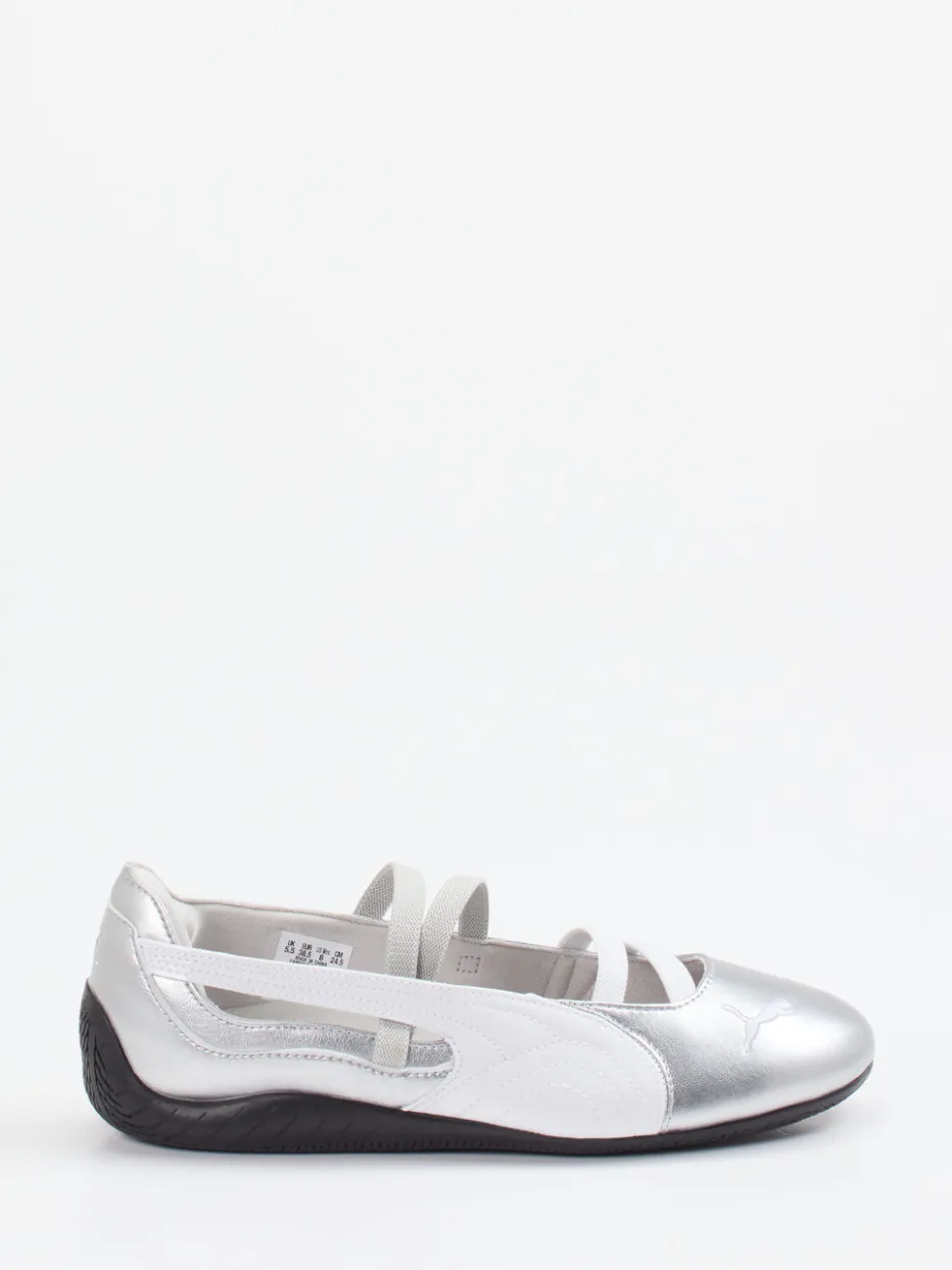 Glanz trifft Komfort.Puma interpretiert den sportlichen Ballerina neu – in einer silberfarbenen Variante mit glänzendem Metallic-Finish. Die flach geformten Damen-Ballerinas überzeugen durch hochwertiges Leder mit glatter Oberfläche, ergänzt um elastische Textilriemen für sicheren Halt. Ton-in-Ton-Logos setzen dezente Markenakzente, während die ergonomisch designte Gummisohle mit griffigem Profil für Tragekomfort sorgt. Der Look: inspiriert vom angesagten Y2K- und Balletcore-Trend – perfekt für Freizeit, Ausgehen oder stylische Alltagsmomente. Harmoniert ideal mit Mini-Bags oder silbernen Accessoires. Ein expressives Statement-Piece mit sportlich-urbaner Leichtigkeit von Puma.