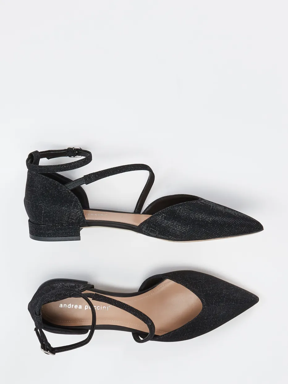 Die Spangenballerinas von Andrea Puccini vereinen femininen Chic mit sanftem Glamour. Ideal für festliche Events oder Sommerpartys: Die Ballerinas aus Metallic-Material mit feinen Glitzerpartikeln zeigen sich in elegantem Schwarz und spitzer Leistenform. Das Lurex-gewebte Obermaterial schimmert edel, während ein asymmetrisches, elastisches Riemchen mit silberfarbener Schnalle sowohl ästhetisch als auch funktional überzeugt. Der flache 2-cm-Absatz sowie die weich gepolsterte Innensohle aus Kalbleder sorgen für Tragekomfort. Inspiriert vom Trend „Quiet Luxury“, funkeln sie dezent und stilbewusst zugleich. Kombinierbar mit Metallic-Clutch oder Cocktailkleid. Ein stilvolles Statement mit handverlesener Materialqualität und modernem Design.