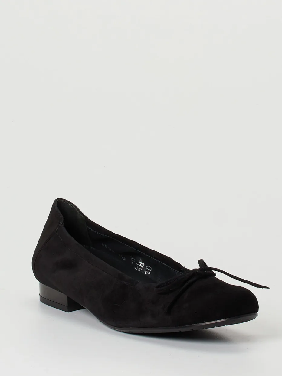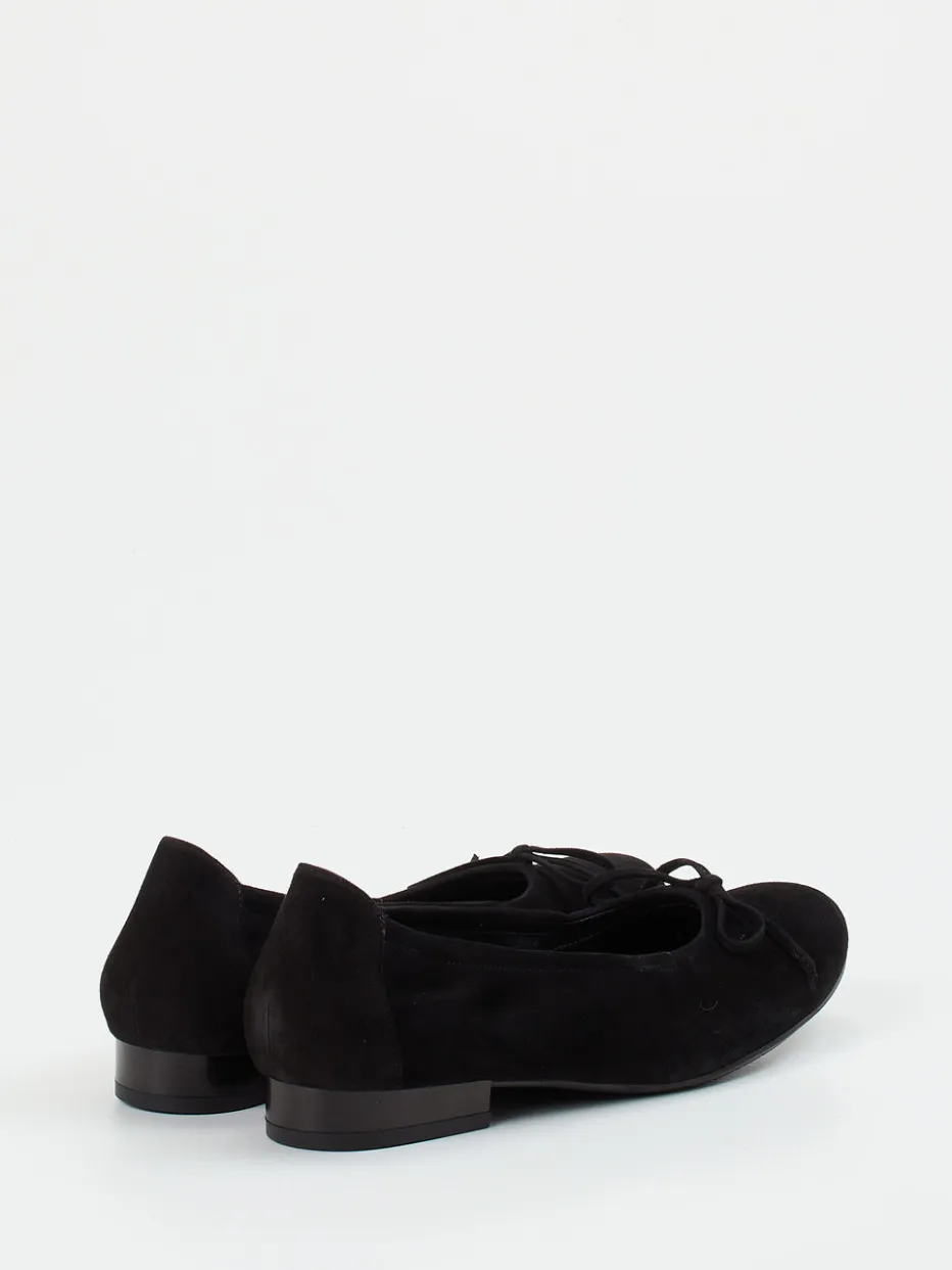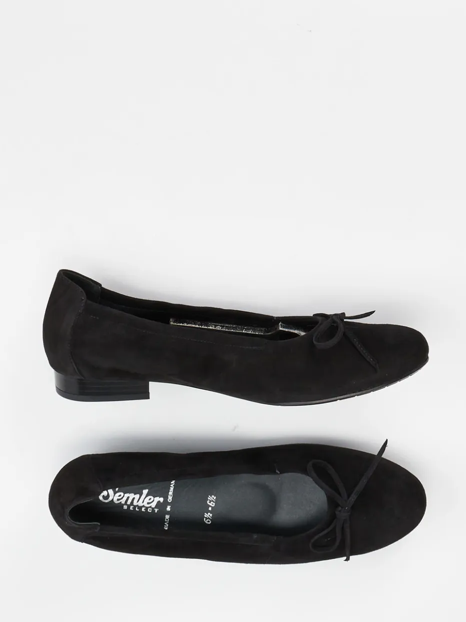 Purismus in Perfektion.Die Marke Semler interpretiert klassische Damen-Ballerinas neu. Dieses Modell überzeugt durch seine schlichte, flach-runde Form und komfortbetonte Ausstattung. Ideal für lange Tage im Büro oder entspannte Spaziergänge. Das hochwertige Veloursleder besitzt eine samtige Haptik und zeigt sich im eleganten Schwarz mit matter Oberfläche. Dezente Highlights: eine tonige, filigrane Zierschleife und der flache Blockabsatz. Der eingearbeitete Gummizug erleichtert das Anziehen und sorgt für passgenauen Halt, während das herausnehmbare, gepolsterte Fußbett auch für Einlagen nutzbar ist. Der Look bewegt sich zwischen Klassik und Quiet Luxury – stilecht für Business-Kombis oder zurückhaltende Casual-Outfits. Hochwertiger Komfort mit zeitlos-dezenter Ästhetik – typisch Semler.