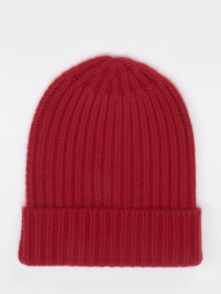 Flauschiger Kaschmir-Strick in intensiver Rotnuance trifft auf klassische Beanie-Silhouette – stilvoller Komfort für kühle Tage.