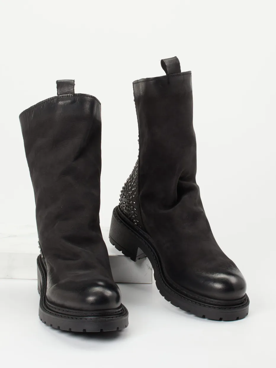Stil trifft Stärke.Konstantin Starke interpretiert Biker-Stiefeletten mit urbaner Präzision. Für selbstbewusste Styles in Alltag oder Ausgehmomenten vereint dieses Modell tiefschwarzes Nubukleder – samtig angeschliffen am Schaft, mit glänzender Glattlederkappe – mit silberfarbenen Nieten am Fersenbereich. Der hintere Reißverschluss sorgt für Komfort, während die stark profilierte Gummisohle und der 3,5 cm hohe Absatz auf urbanes Terrain vorbereitet sind. Die gerade Silhouette, Zuglaschen und das ungefütterte Innenleben runden die saisonale Vielseitigkeit ab. Ein Hingucker im „Chunky Boots“-Trend mit Rock Chic-Flair. Markanter Komfort mit progressivem Stilverständnis – ein Highlight von Konstantin Starke.