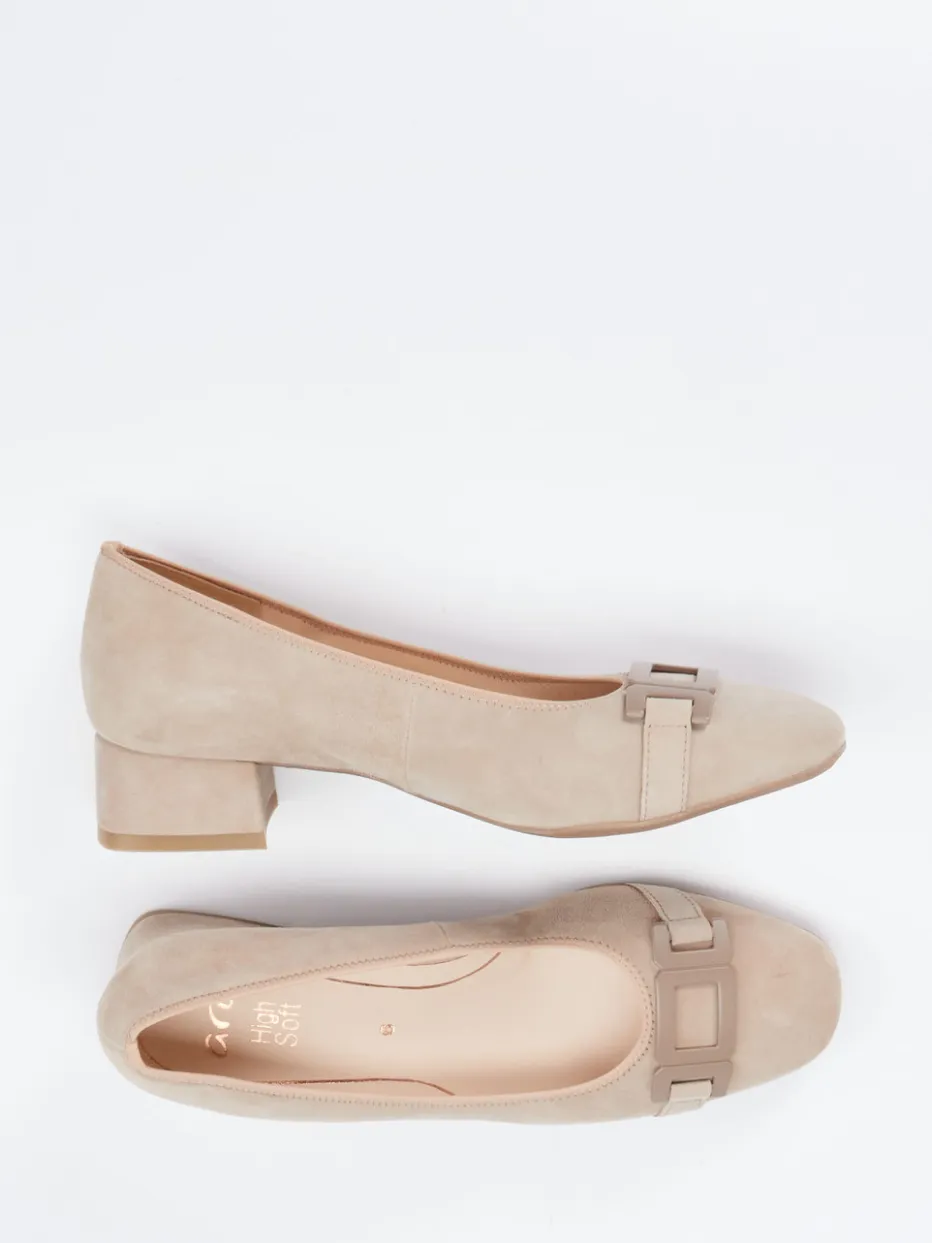 Schlichte Eleganz fürs Büro und darüber hinaus.Ara präsentiert mit diesem Pumps einen stilvollen Klassiker für Alltag und Business. Ideal für lange Bürotage oder gepflegte Freizeitlooks bietet der Pumps aus beigefarbenem, samtig angeschliffenem Veloursleder angenehmen Tragekomfort dank High-Soft-Fußbett und weichem Lederfutter. Die klassische, gerundete Form wird durch eine tonale Kunststoffschnalle auf dem Blatt akzentuiert. Die rutschhemmende Gummisohle mit Profil und der bequeme Blockabsatz runden das funktionale Design ab. Modisch eingebettet in den Trend „Quiet Luxury“, eignet sich das Modell perfekt für stilbewusste, komfortorientierte Looks. Kombiniert mit hellen Blazern oder Taschen entsteht ein stimmiger Auftritt. Premium-Komfort im dezenten Design – Ara Qualität.