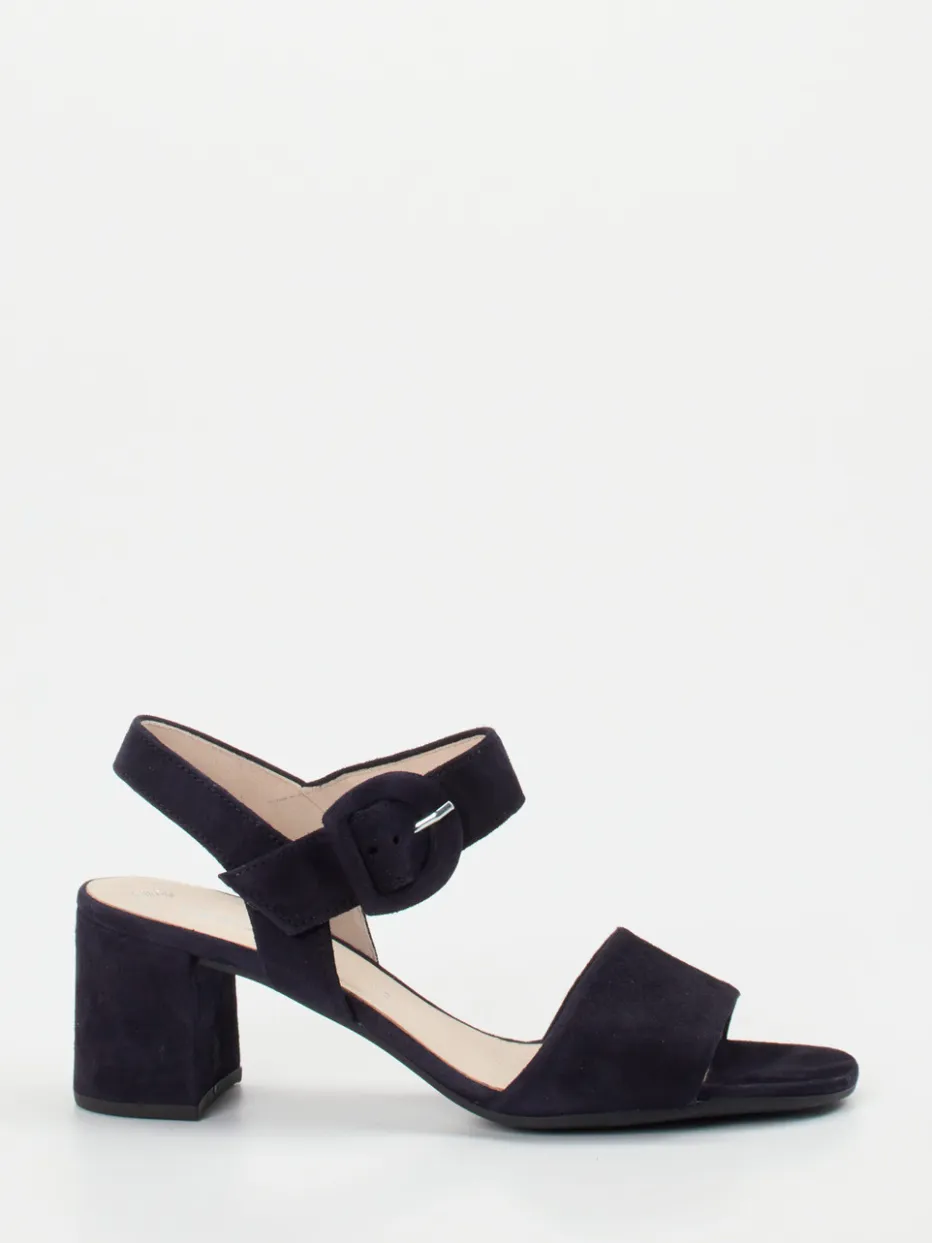 Diese dunkelblauen Sandalen überzeugen mit samtigem Veloursleder, schlichtem Ton-in-Ton-Design und angenehmer Absatzhöhe – ein stilvoller Begleiter für viele Anlässe.