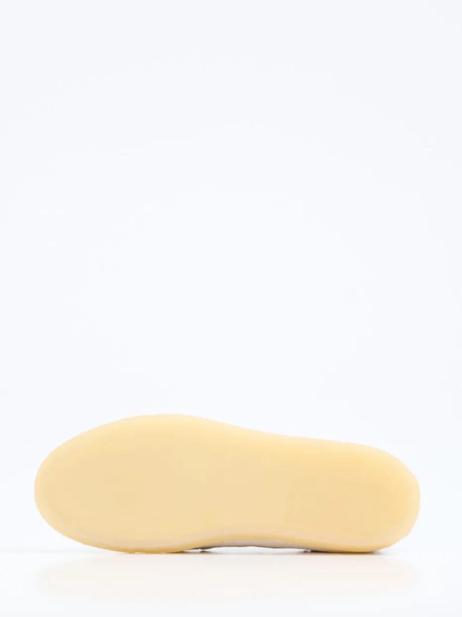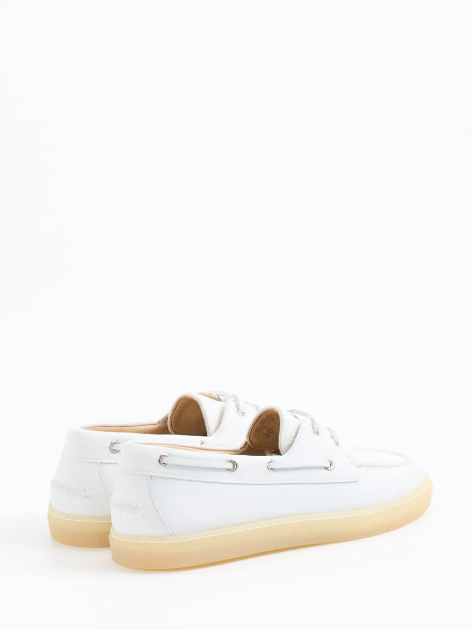 Minimalistisch maritim gedacht.Copenhagen interpretiert mit diesem Damen-Bootsschuh die klassische Marine-Ästhetik modern und stilvoll. Ob beim Stadtspaziergang oder auf der Uferpromenade – das matte, weiß gefärbte Kalbleder schmiegt sich weich an den Fuß und punktet mit hochwertiger Oberflächenstruktur. Die flache, rund geformte Silhouette mit offenkantiger Naht, silberfarbenen Metallösen und umlaufendem Lederband sorgt für lässige Preppy-Vibes. Die flexible, honigfarbene Gummisohle ergänzt ideal den leichten Charakter. Ein wechselbares, lederbezogenes Fußbett erhöht den Tragekomfort. Kombiniert mit Leinenhose und Strohtasche entsteht ein stilvoller Sommerlook. Stilvoller Komfort im Zeichen zeitloser nordischer Eleganz.