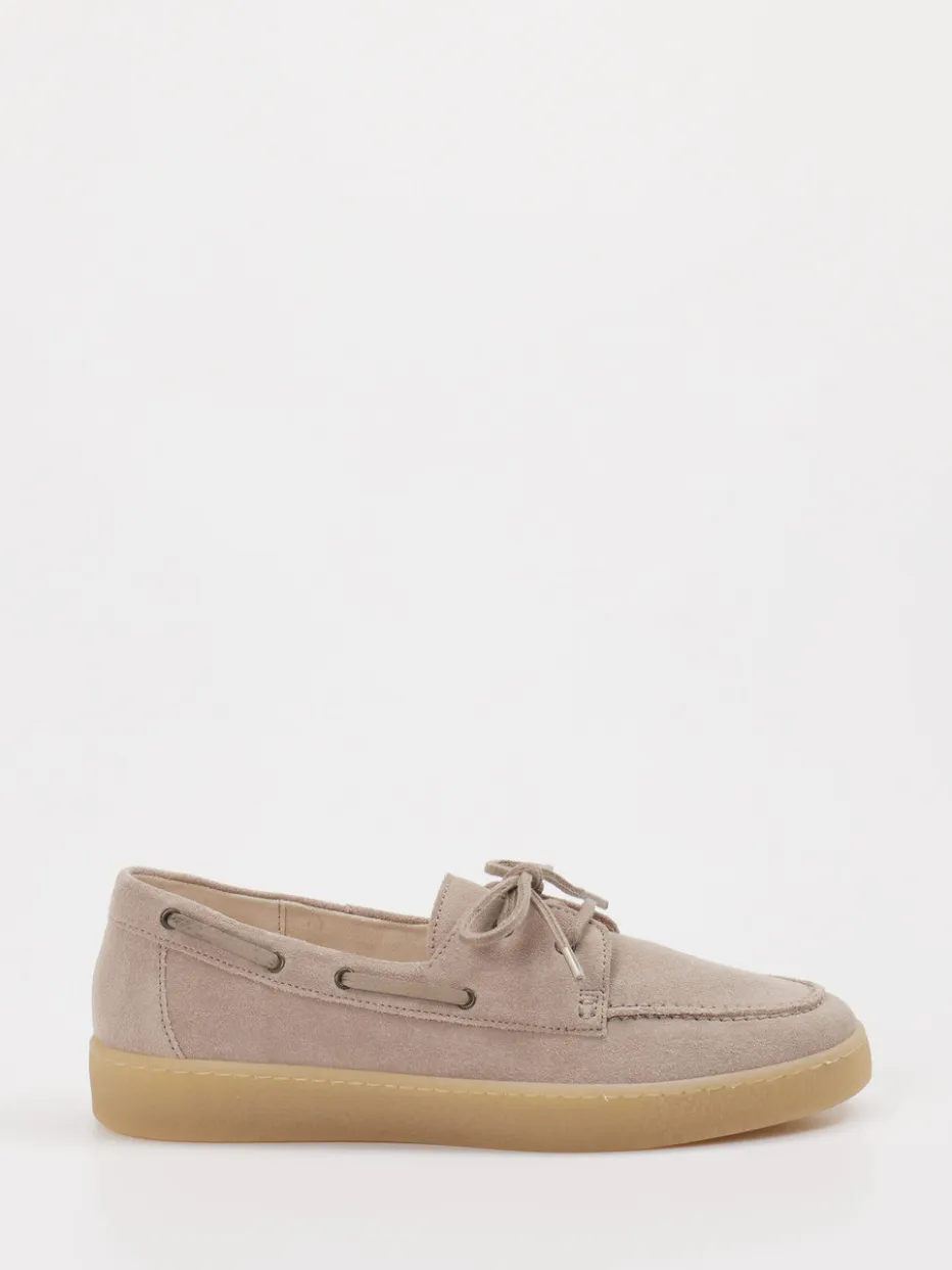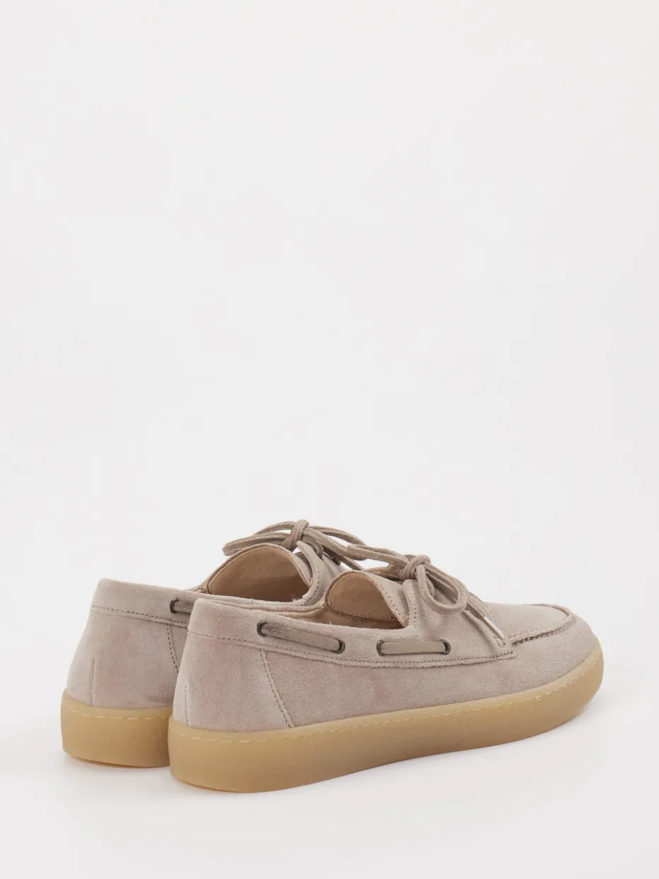 Ideal für entspannte Tage am Wasser oder urbane Spaziergänge – das beigegraue Veloursleder mit matter Oberfläche bringt zurückhaltende Raffinesse in den Alltag. Die klassische, flache Silhouette wird ergänzt durch ein umlaufendes Lederband und eine flexible Schnürung mit alt-silberfarbenen Ösen. Für hohen Komfort sorgen die gepolsterte Innensohle sowie die rutschfeste Gummisohle. Der Look fügt sich perfekt in die Trends um „Quiet Luxury“ und „Soft Neutrals“ ein. Kombiniert mit Leinenhose oder luftigem Rock ergibt sich ein stimmiger Sommerstil.