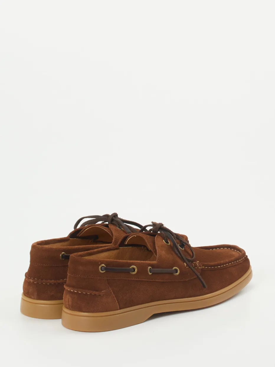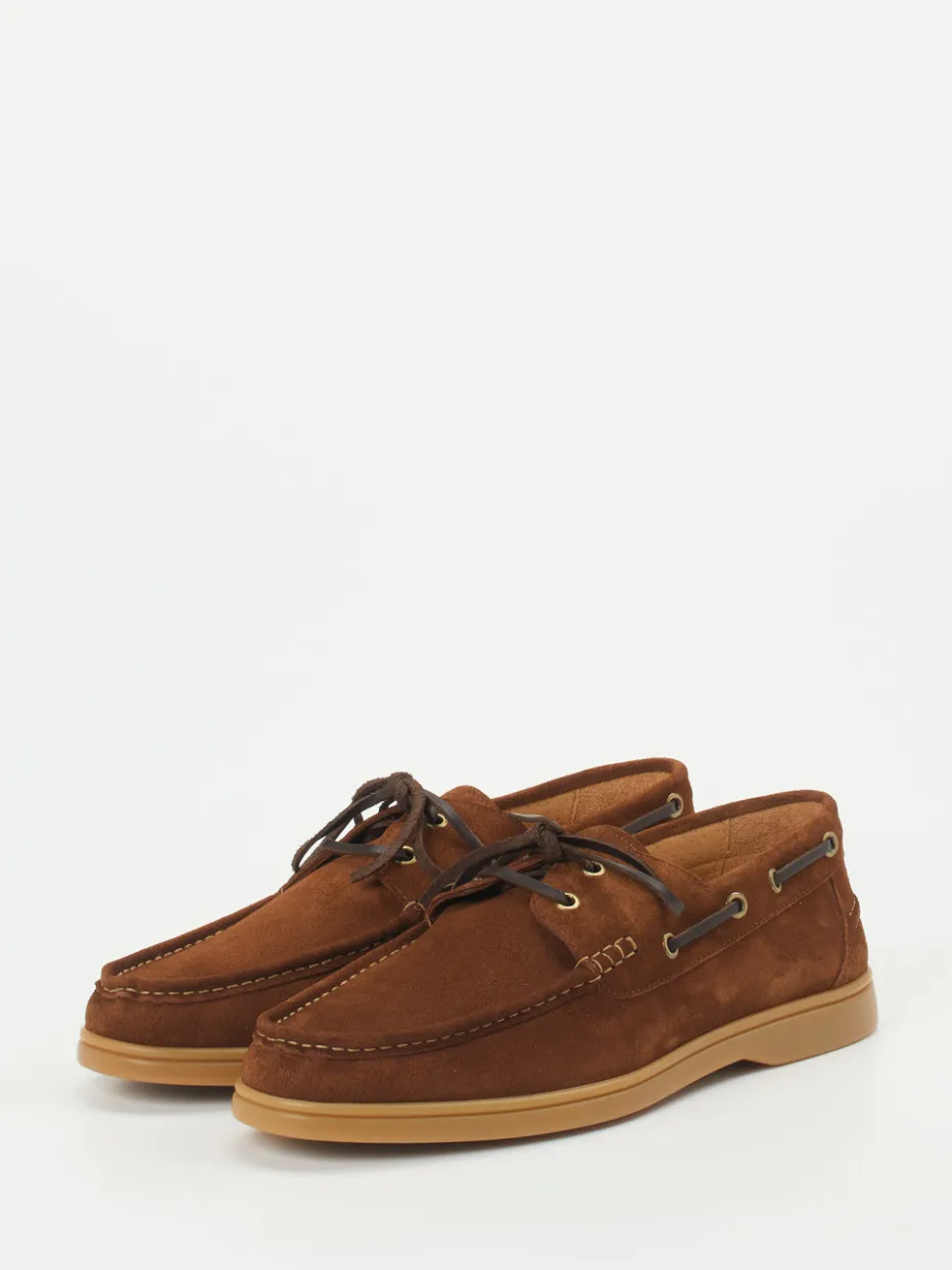 Ideal für Urlaub oder Freizeit überzeugt das Modell durch rostbraunes, samtig strukturiertes Veloursleder, goldfarbene Ösen und Kontrastnähte im klassischen Schnitt. Die umlaufende Lederapplikation und eine lederne Zweiloch-Schnürung verleihen ihm maritimen Charakter. Die honigfarbene Gummisohle bietet rutschfesten Komfort und unterstreicht den heritage-inspirierten Look. Kombiniert mit Leinenhemd und Chino entsteht ein entspannter Sommerstil.
