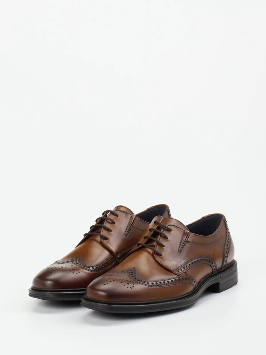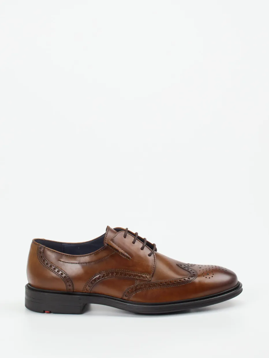 Stilvoller Klassiker neu gedacht.Lloyd präsentiert mit diesem Brogue-Schnürschuh ein Modell für Herren mit Sinn für Tradition und Komfort. Der cognacbraune Schuh aus hochwertigem Kalbleder greift mit einer markanten Flügelkappe, rosettenverzierter Lochung und glänzender Oberfläche die Ästhetik klassischer British-Brogues auf. Dezente Elasteinsätze und weiches Textil-Lederfutter sorgen für optimale Passform und angenehmes Tragen – auch über viele Stunden. Die flache Form in Kombination mit einer profilierten Gummisohle verleiht sicheren Halt im Alltag. Perfekt zu Navy-Anzug oder Wollhose für einen „Quiet Luxury“-Look. Handwerkskunst und Komfortkompetenz aus dem Hause Lloyd – für den modernen Business-Alltag.