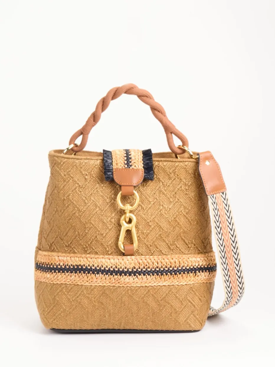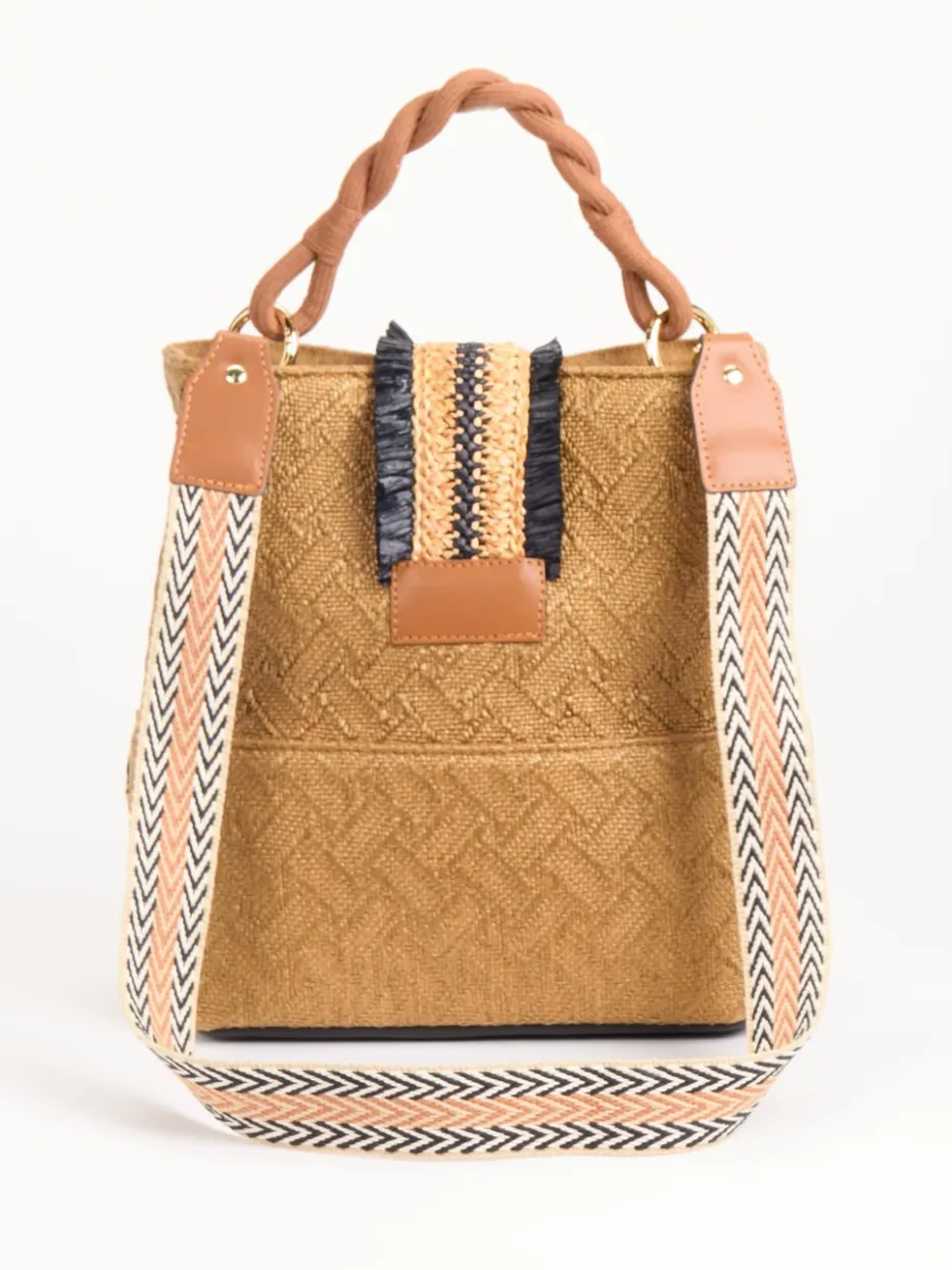 Diese Bucket Bag aus gewebtem Textil besticht durch ihren raffinierten Materialmix, saisonalen Boho-Charme und funktionale Vielseitigkeit für urbane wie entspannte Looks.