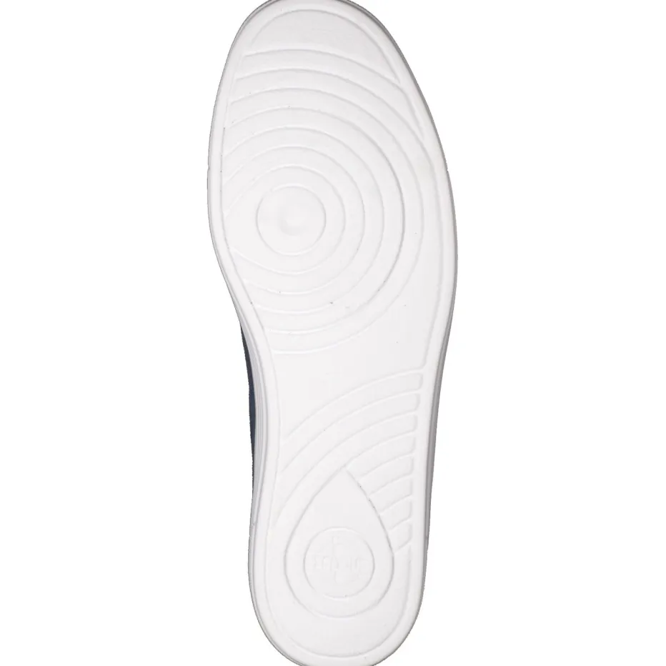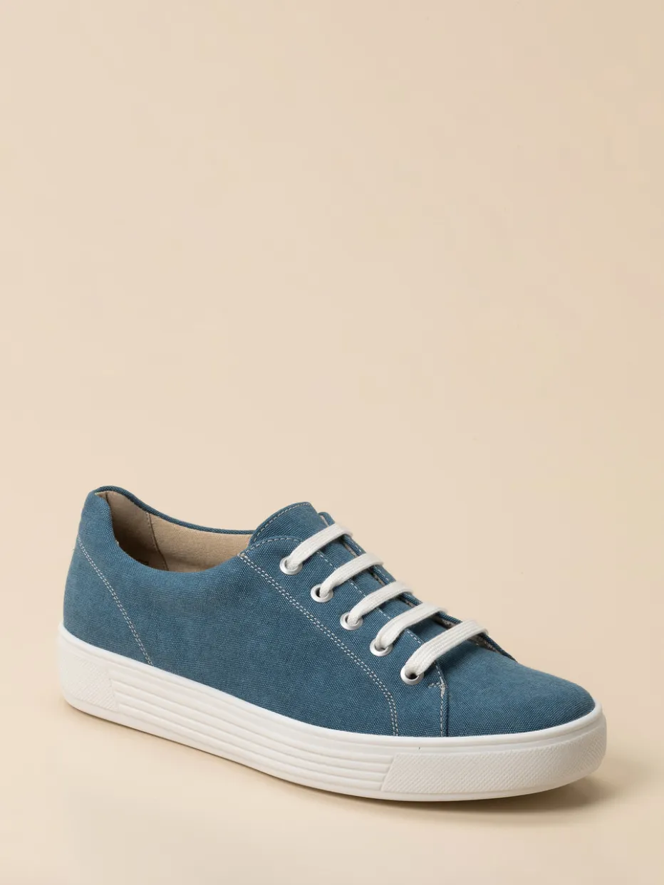 Sommerlicher Komfort in Canvas.Solidus interpretiert den klassischen Canvas-Sneaker neu und verbindet casual Design mit hochwertiger Ausstattung für Damen. Ideal für Freizeit oder Urlaub überzeugt der Schnürschuh mit einem Obermaterial aus Textil, das in Jeansblau matt gehalten ist und durch weiße Kontrastnähte sowie Schnürung aktiv betont wird. Die klar geschnittene Silhouette mit verstärkter Ferse trifft auf eine griffige PU-Sohle in Weiß. Innen sorgt ein lederbezogenes Korkfußbett mit Memo-Luftpolster für höchsten Komfort – herausnehmbar und geeignet für Einlagen. Die minimalistische Optik passt zu Soft Utility Looks. Ein Sneaker, der durch zeitlose Farbgebung und ergonomische Features überzeugt.