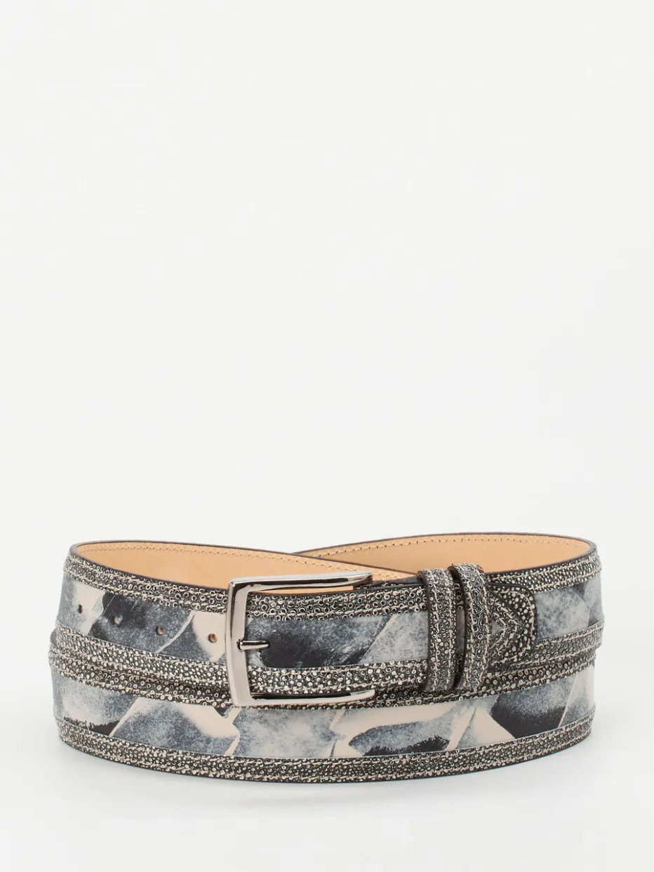 Dieser Gürtel der Marke Harris ist ein extravagantes Accessoire, das Ihre Garderobe stilsicher aufwerten wird! Das Druckleder zeigt ein attraktives Muster in dunkelblau und schwarz. Eingerahmt wird es von zwei 3D-Kontraststreifen in schwarz-weiß. Einen gelungenen Abschluss bildet die markante silberfarbene Schnalle. – Material: Druckleder – Farbe: Schwarz, Blau, Weiß – Länge: ca. 125 cm – Breite: ca. 3,5 cm