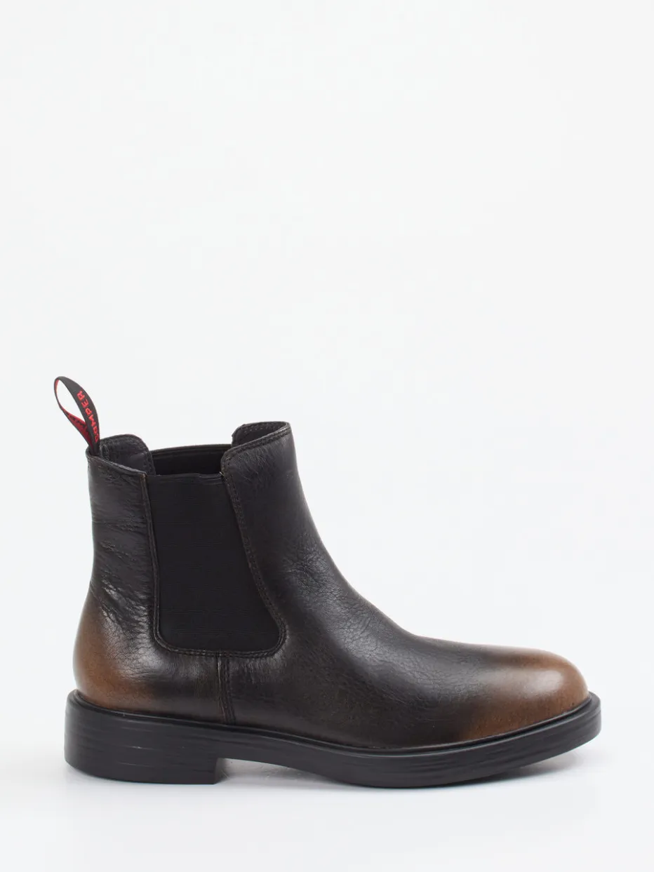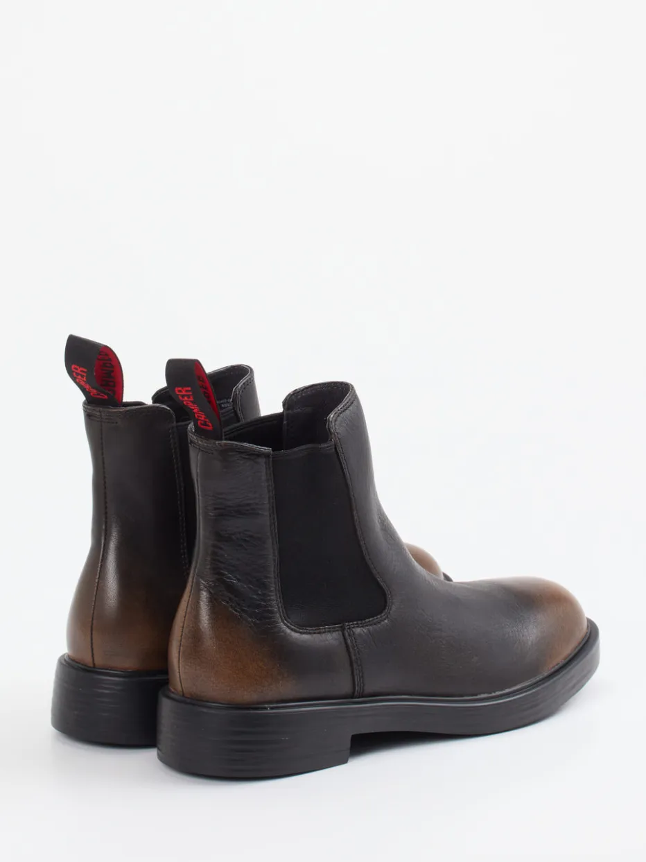 Urbaner Chic trifft dezente Raffinesse.Camper präsentiert stilvolle Chelsea Boots mit flacher Sohle und markanter Farbgebung. Für Büro, City oder Barabende – die glatt genarbten Leder-Boots mit dunkelbraun-schwarzem Farbverlauf und roter Zuglasche überzeugen durch ihre klare, knöchelhohe Silhouette. Elastikeinsätze sorgen für einfaches Hineinschlüpfen und komfortablen Sitz, die strukturierte Gummisohle bietet zuverlässigen Grip. Das Finish mit Two-Tone-Optik unterstreicht den minimalistischen Streetwear-Charakter und verleiht dem Outfit einen Hauch von „Quiet Luxury“. Kombiniert mit schwarzen Wollmänteln oder Lederaccessoires entsteht ein stilsicherer Look. Authentisches Camper-Design mit alltäglichem Komfortanspruch.