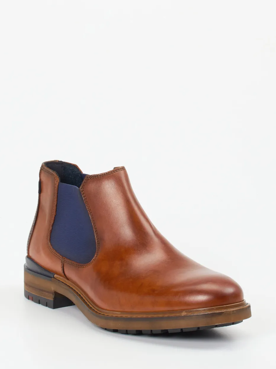 Cognacfarbenes Kalbleder trifft auf navyblaue Elastikeinsätze: Ein Chelsea Boot im modernen Heritage-Stil mit profilierter Gummisohle für sicheren Tritt.