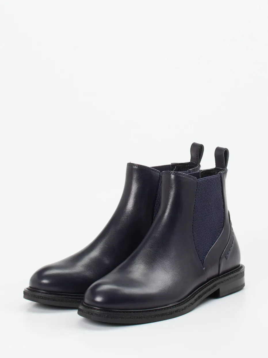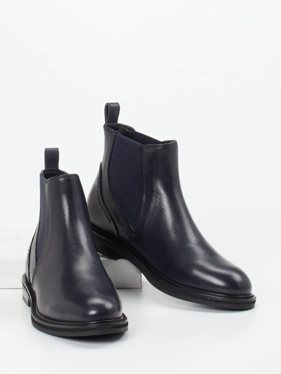 Modernes Understatement in Blau.Maripé interpretiert den Chelsea Boot in eleganter Damenmanier. Die dunkelblauen Stiefeletten bieten mit glänzendem Kalbleder und tonalen Elastikeinsätzen einen stilvollen Begleiter für Büro und Alltag. Die knöchelhohe, schmal zulaufende Passform und dezente Nahtdetails unterstreichen den minimalistischen Charakter. Ein bequemes Lederfutter, Zuglasche und strapazierfähige Gummisohle sorgen für Komfort. Stilistisch zwischen Modern Classics und British Heritage verortet, passen sie perfekt zu grauem Wollmantel oder schmaler Stoffhose. Ein Modell mit hochwertiger Ausstrahlung und femininer Klarheit – typisch Maripé.