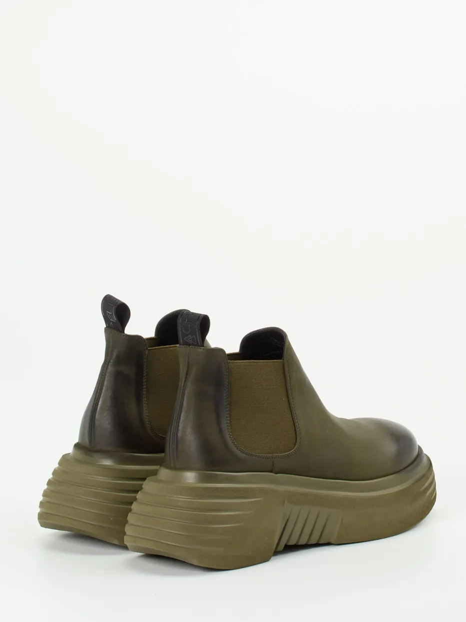 Ein avantgardistisches Statement-Piece mit olivgrünem Kalbleder, tonalen Elastikeinsätzen und markanter Chunky-Sohle – perfekt für progressive Streetwear-Looks.