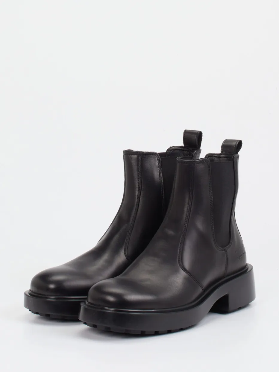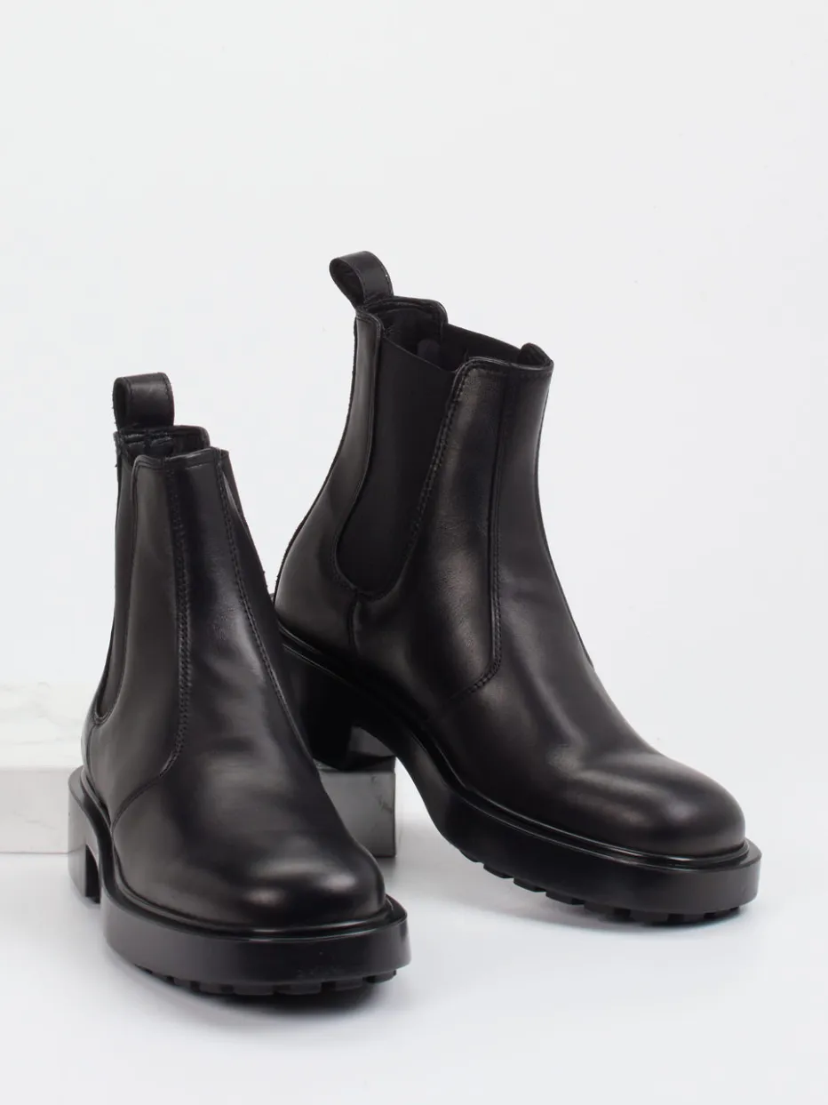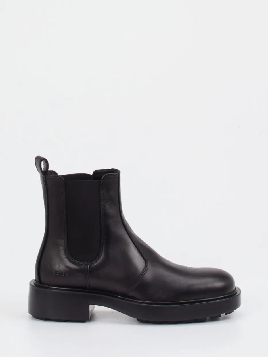 Minimalismus trifft urbanen Charakter.Copenhagen setzt mit diesen Damen-Chelsea Boots auf klare Silhouetten und kompromisslose Qualität. Schwarzes Kalbleder mit matter Oberfläche und tonigen Nähten bildet die Basis eines Designs, das schlichte Eleganz mit griffigem Profil vereint. Die knöchelhohe Form, elastische Einsätze und praktische Zuglaschen ermöglichen komfortables Hineinschlüpfen. Der angesagte „Heavy Sole“-Look bringt modische Präsenz im Alltag wie im Büro. Mit geprägtem Logo an der Ferse bleibt der Stil bewusst zurückhaltend. Perfekt kombinierbar zu Wollmänteln oder klar geschnittenen Hosen-Looks. Copenhagen bietet mit diesem Modell zeitlosen Stil in kompromissloser Qualität.