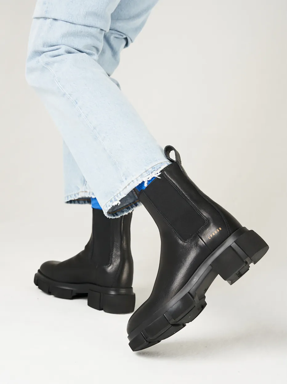 Minimalismus modern interpretiert.Die Marke Copenhagen präsentiert klassische Chelsea Boots für Damen in markanter Urban-Ästhetik. Ideal für den Alltag in der Stadt oder entspannte Office-Looks: Diese Knöchelstiefeletten sind aus schwarzem Kalbleder gefertigt, dessen mattes Finish Eleganz und Zurückhaltung vereint. Seitliche Elastikeinsätze, eine praktische Zuglasche und die charakteristisch grobstollige Gummisohle unterstreichen das funktionale Design. Die goldfarbene Logoprägung an der Ferse setzt einen stilvollen Akzent. Trendbewusst fügt sich das Modell in aktuelle Streetwear-Strömungen wie den Chunky-Sole- und Quiet-Luxury-Trend ein. Perfekt kombinierbar zu Wollmänteln oder monochromen Looks. Robuste Eleganz mit klarer Markenidentität.