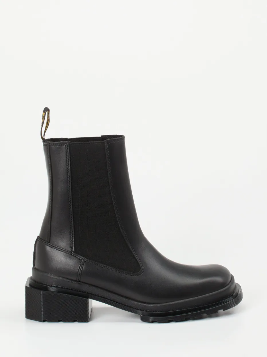 Kontrast aus Klassik und Trend.Dr. Martens interpretiert mit der Stiefelette Maybole Chelsea eine urbane Ikone neu. Für selbstbewusste Auftritte im Alltag oder beim Ausgehen bietet das Modell mit schwarzem Kalbleder samt seidig-matter Oberfläche und markantem Blockabsatz ein starkes Profil. Elastikeinsätze gewährleisten bequemen Einstieg, während farblich abgesetzte Zuglaschen mit Markenwording stilistische Akzente setzen. Die unverkennbare Silhouette mit betonter Laufhöhe wirkt kraftvoll und modern – passend zur aktuellen Chunky-Trendbewegung. Vielseitig kombinierbar mit Oversize-Mantel oder Strickkleid überzeugt diese Stiefelette durch langlebige Qualität und typisches Dr. Martens-Design.