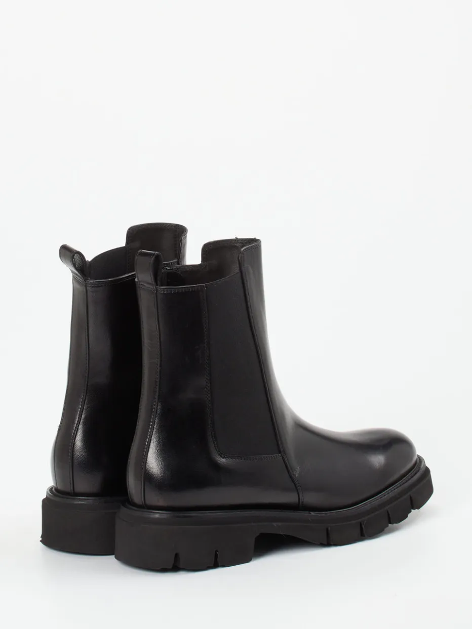 Ideal für den modernen Alltag zwischen Stadtbummel und Büro: Das schwarze Kalbleder zeigt sich in glänzender Ausführung und wirkt besonders edel. Ton-in-Ton gearbeitete Elastikeinsätze und seitliche Zuglaschen erleichtern das Anziehen. Die klobige Gummisohle im Heavy-Sole-Trend schenkt ein urbanes Finish und unterstützt ein angenehmes Laufgefühl – verstärkt durch das weiche Lederfutter. Die schmale Silhouette passt hervorragend zu Kaschmirmantel oder Hosen in Zigarettenform.