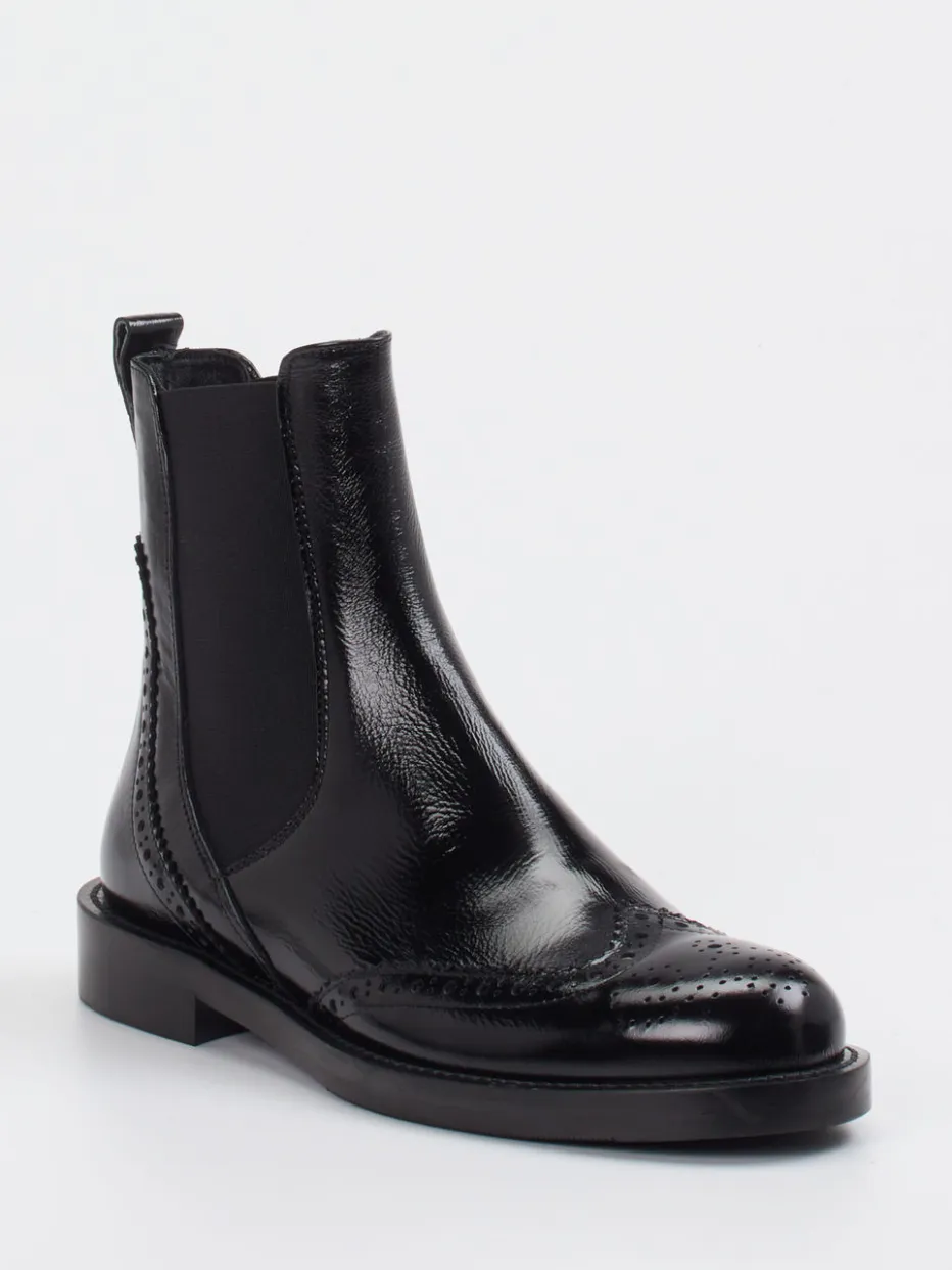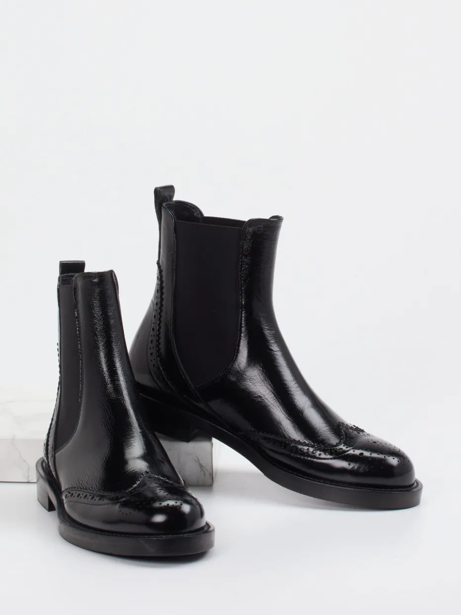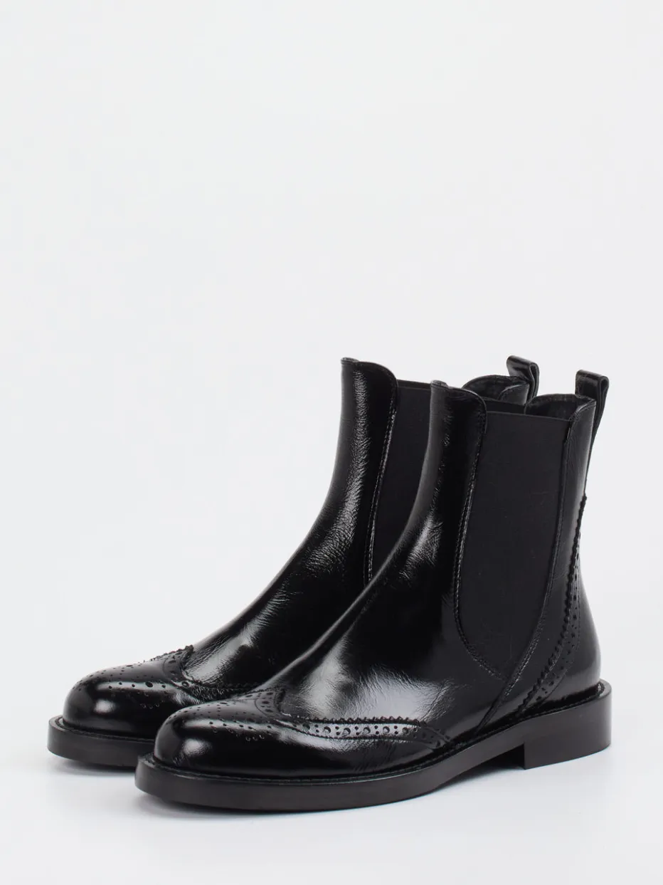 Diese Chelsea Boots kombinieren hochglänzendes Lackleder mit klassischen Brogue-Details und minimalistischem Design – eine stilvolle Wahl für Herbsttage mit Anspruch.