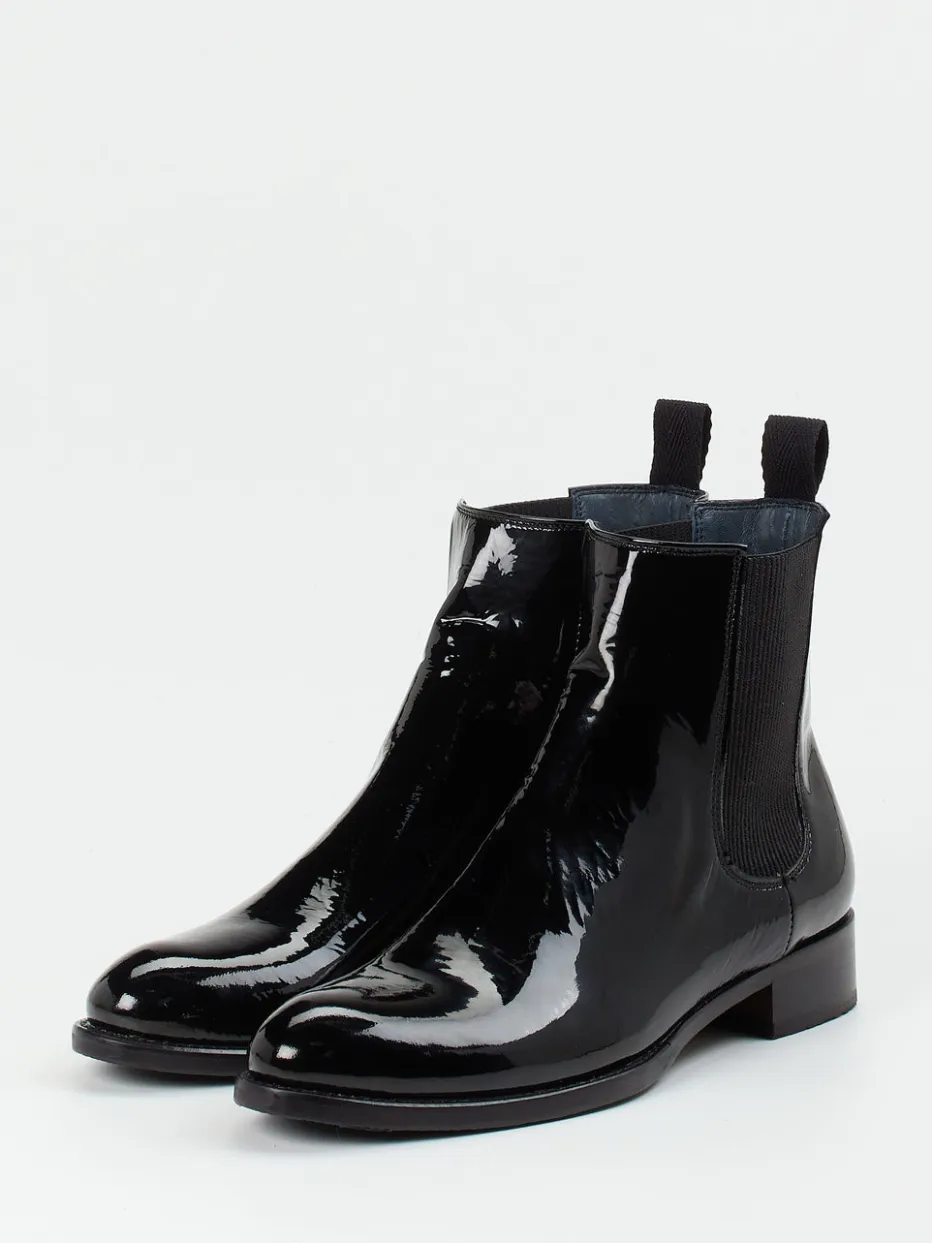 Diese Chelsea Boots kombinieren glänzendes Lackleder mit klassischer Formensprache – ein stilvoller Akzent für minimalistische Looks mit hochwertigem Anspruch.