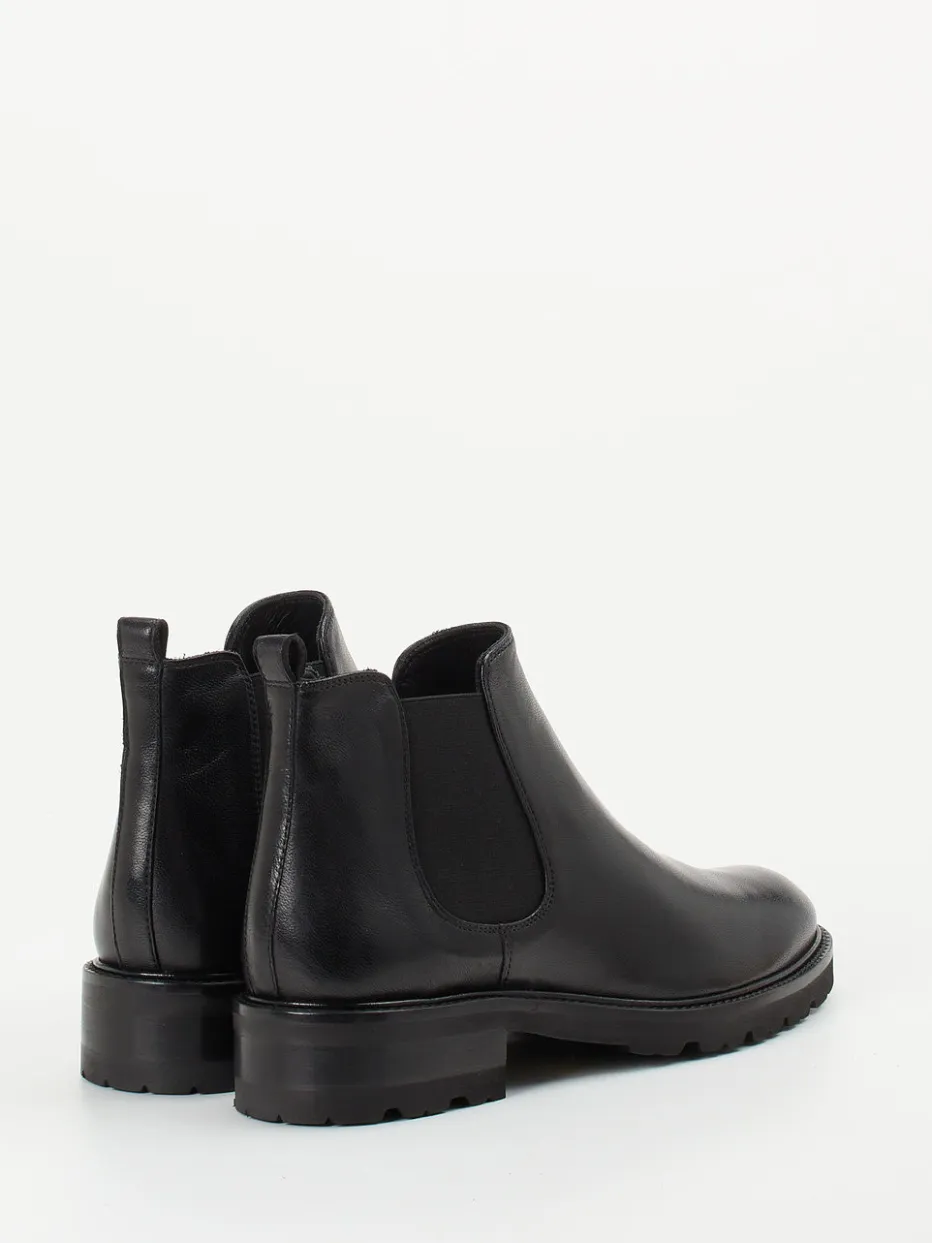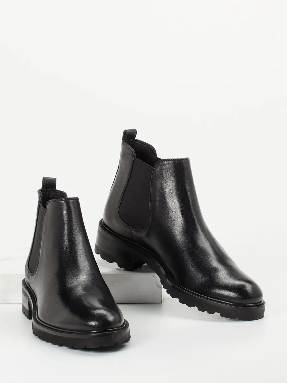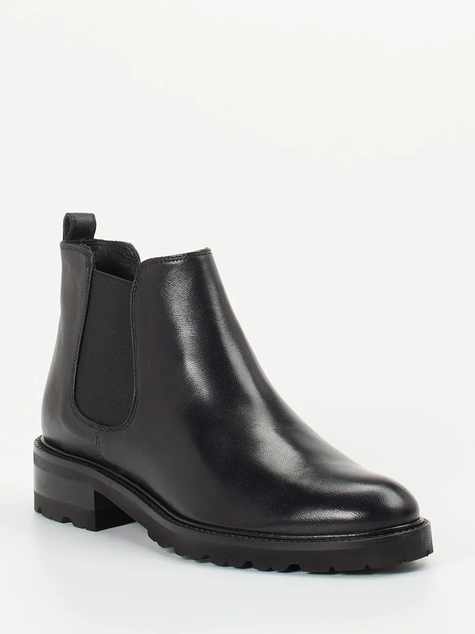 Perfekt für den Weg ins Büro oder den City-Bummel bieten sie mit schwarzem, glänzendem Lammleder und beidseitigen Ton-in-Ton-Elastikeinsätzen ein souveränes Erscheinungsbild. Die knöchelhohe, schmal zulaufende Silhouette wird durch eine robuste Gummisohle mit markantem Profil unterstrichen – im Trend der Heavy-Sole-Bewegung. Eine rückseitige Zuglasche erleichtert den Einstieg, die lederne Innenpolsterung steigert den Tragekomfort. Minimalistischer Chic trifft auf funktionalen Stil, ideal zu Wollmantel und Lederaccessoires.