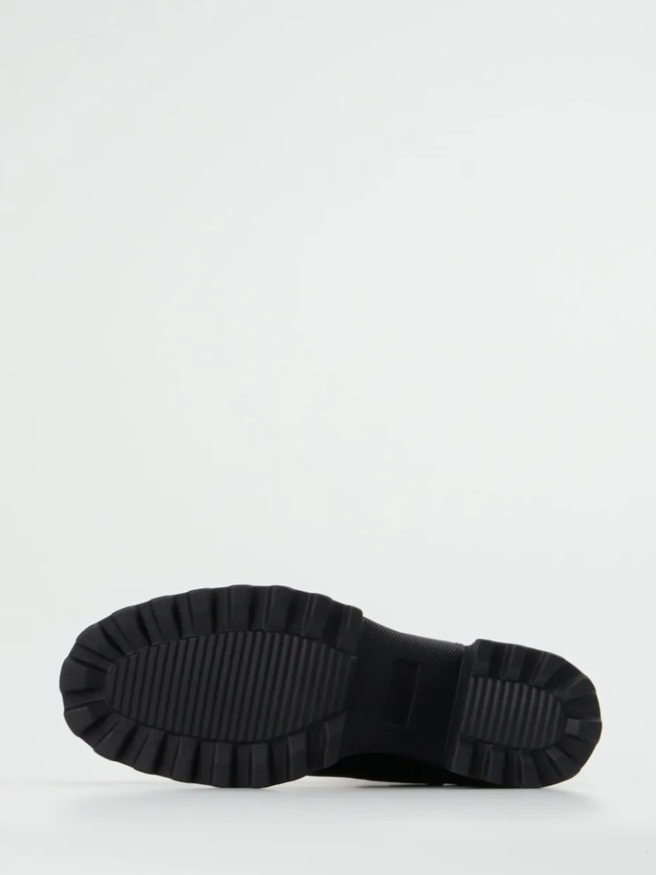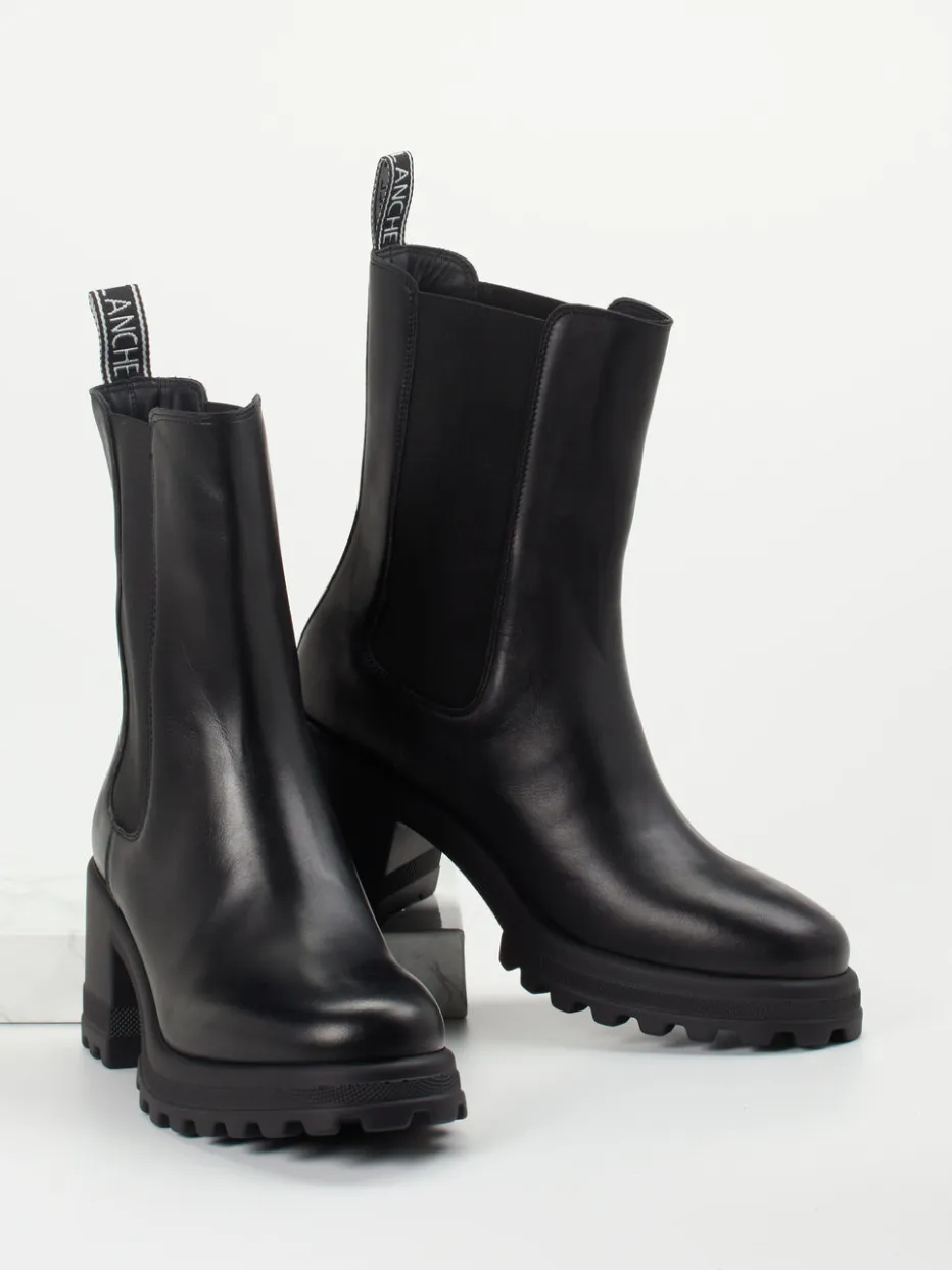 Ideal für einen souveränen Auftritt zwischen Büro und Freizeit: Das glänzend veredelte Lammleder in tiefem Schwarz unterstreicht die minimalistische Linie. Klassisch-knöchelhoch geschnitten, mit beidseitigen Elastikeinsätzen und Zuglasche samt Logo-Schriftzug, lassen sich die Boots bequem hineinschlüpfen. Die robuste Gummiprofilsohle mit 7 cm Blockabsatz ergänzt nicht nur den angesagten Chunky-Look, sondern sorgt auch für erhöhten Tragekomfort. Ein Modell, das modische Klarheit mit urbaner Nonchalance vereint – kombinierbar zu Wide-Leg-Hosen wie Strickkleidern.