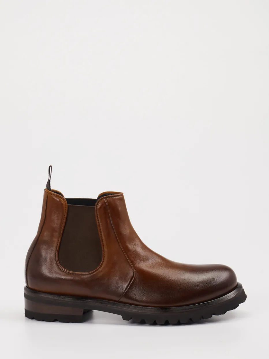 Der glänzende Farbverlauf auf hochwertigem Kalbleder verleiht diesen Chelsea Boots von Shoto einen besonders stilvollen Charakter. Eine markante Vibram-Sohle sorgt für zuverlässige Traktion im Alltag.