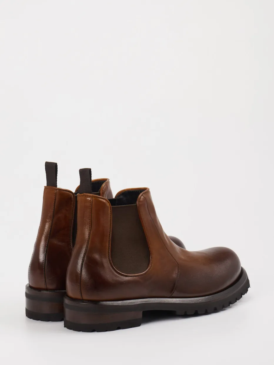 Modernes Understatement mit Heritage-Akzent. Shoto interpretiert die klassischen Chelsea Boots neu im maskulinen Stil. Diese Herren-Stiefeletten verbinden glatt glänzendes Kalbleder in Mittelbraun mit einem dezenten Farbverlauf. Die knöchelhohe, rund zulaufende Silhouette wird mithilfe seitlicher Elastikeinsätze und einer Zuglasche komfortabel ergänzt. Eine profilierte Vibram-Sohle aus Gummi unterstreicht den Workwear-Einfluss und bietet hohe Trittsicherheit. Tonal abgestimmte Details und der Verzicht auf unnötige Zierelemente machen das Design zum idealen Begleiter für Business und Freizeit. Optimal zu Wollhosen oder Denim kombinierbar. Robustheit trifft auf Komfort in Shoto-typischer Verarbeitungsqualität.