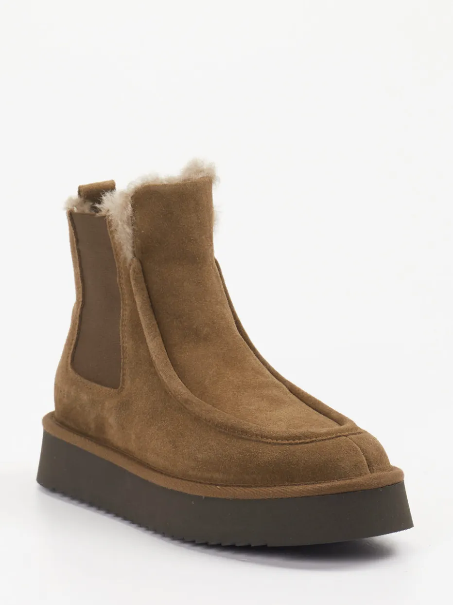 Warm durch den Winter. Copenhagen präsentiert diese gefütterten Chelsea Boots aus der Damenkollektion. An kalten Tagen bieten diese mittelbraunen Leder-Stiefeletten mit sichtbarem Kunstfellfutter den perfekten Mix aus Komfort und urbanem Design. Das glatte Veloursleder mit matter Optik harmoniert mit tonalen Nähten und einem funktionalen Elastikeinsatz. Die robuste, 3,5 cm hohe Profilsohle aus Gummi sorgt für sicheren Halt, während Zuglasche und unkomplizierte Schlupfform das Anziehen erleichtern. Der chunky Look und Minimalismus-Charakter werten jedes entspannte Winteroutfit auf – perfekt zu Oversize-Strick oder Steppjacke. Copenhagen steht hier für stilvolle Lässigkeit mit durchdachten Winterfeatures.