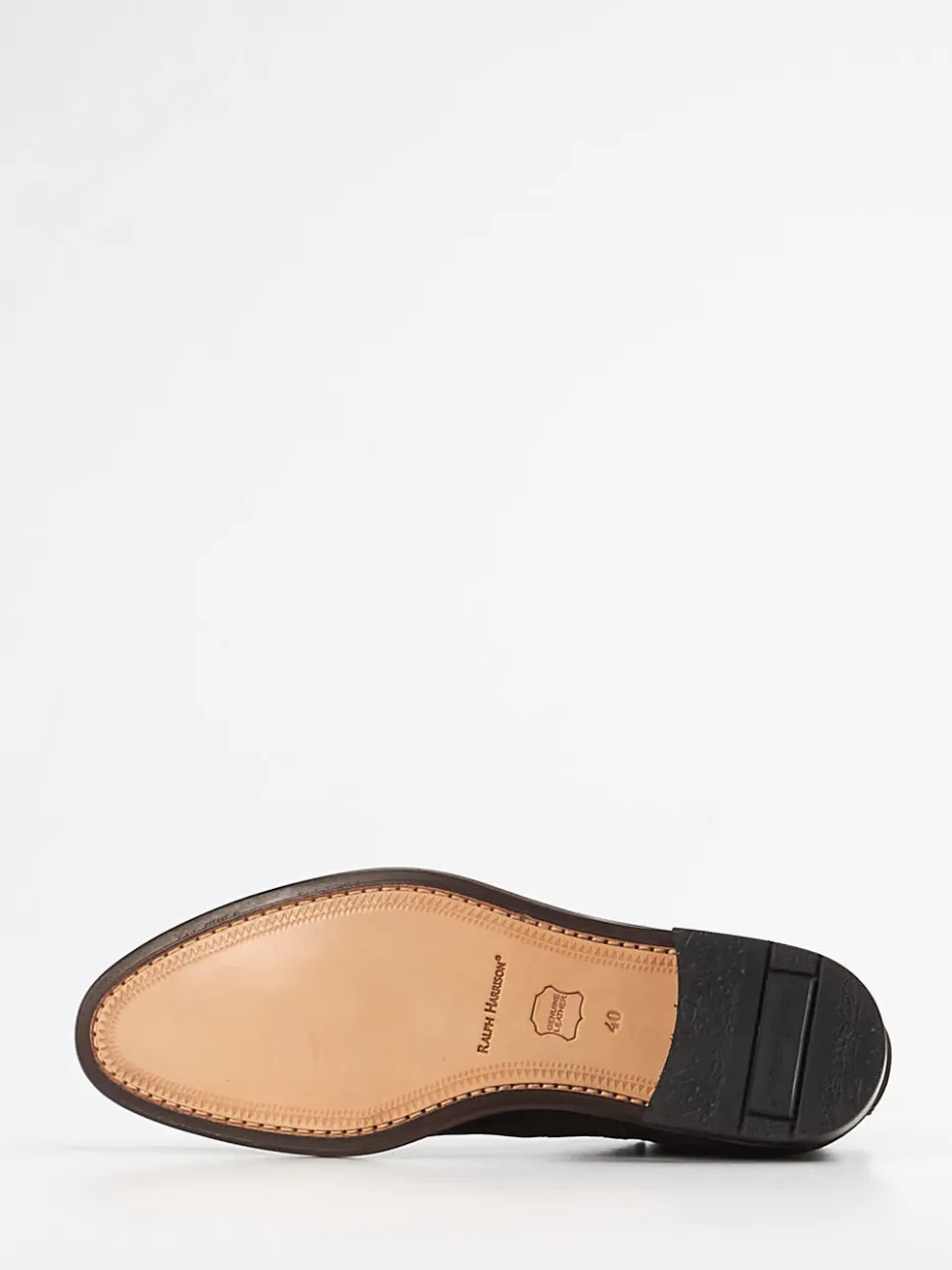 Stilvoller Klassiker für urbane Looks.Die Herren-Chelsea Boots von Ralph Harrison verbinden formbetonte Eleganz mit dezenten Details. Im Büro oder bei eleganter Freizeitkleidung bieten die rahmengenähten Stiefeletten aus samtig angeschliffenem Veloursleder in Anthrazit stilvolle Zurückhaltung. Der feine Glanz der matten Oberfläche wird durch tonale Kontrastnähte und seitliche Elastikeinsätze ergänzt – klassisch und funktional zugleich. Die knöchelhohe Silhouette mit praktischer Zuglasche sitzt passgenau am Fuß, während die Ledersohle mit integriertem Gummieinsatz für zusätzliche Alltagstauglichkeit sorgt. Perfekt kombinierbar zu Wollhose oder dunklem Denim. Ein hochwertiger Begleiter für moderne Gentlemen mit Sinn für zeitloses Understatement.