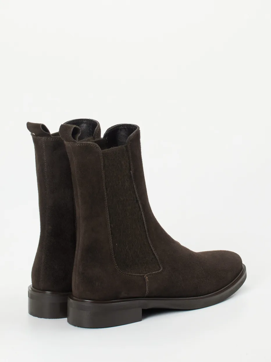 Die Chelsea Boots von Andrea Puccini verbinden klassisch-britischen Chic mit minimalistischer Modernität – gefertigt aus samtig dunkelbraunem Veloursleder und ergänzt durch dezente Designakzente.