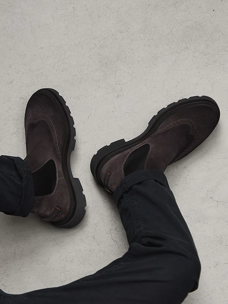 Heritage trifft modernen Streetstyle.Die Marke Santoni präsentiert elegante Chelsea Boots für Herren. Ob für einen stilvollen Büroauftritt oder den gepflegten Freizeitlook – dieses Modell erfüllt hohe Ansprüche an Qualität und Design. Gefertigt aus hochwertigem Veloursleder mit samtig-matter Oberfläche und Brogue-Lochmuster überzeugt es durch eine klassisch-knöchelhohe Silhouette. Elastikeinsätze in Schwarz und eine robuste Profilsohle aus Gummi sorgen für Komfort und sicheren Tritt. Das leuchtend orangefarbene Innenfutter aus Kalbleder zeigt Sinn für moderne Akzente. Feinste Verarbeitung und maskuliner Stil für urbane Herbsttage – typisch Santoni.