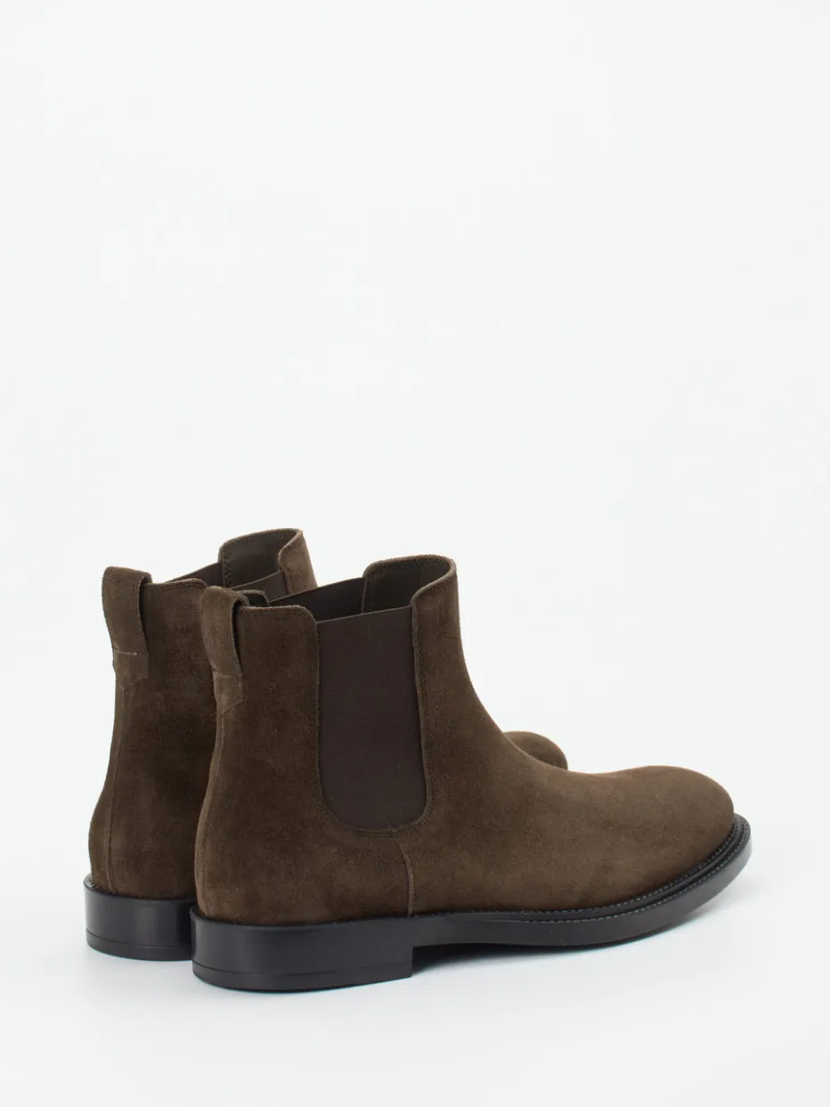 Minimalismus mit Charakter.Tod’s setzt mit diesen Herren-Chelsea Boots auf klassische Eleganz und hochwertige Verarbeitung. Für den stilvollen Auftritt im Alltag oder Business bieten diese Boots aus samtig angeschliffenem Veloursleder in Dunkelbraun eine zeitlose Basis. Die klassische, knöchelhohe Silhouette kombiniert mit Ton-in-Ton Elastikeinsätzen und Zuglasche sorgt für hohen Komfort beim Anziehen. Die schwarze Gummisohle mit rutschhemmenden Gummipunkten bietet sicheren Halt – auch bei herbstlichem Wetter. Dezente Design-Details wie die leicht abgerundete Zehenpartie und ein fein integriertes Markenlogo runden das cleane Erscheinungsbild ab. Ideal kombinierbar mit Kaschmirpullover und Wollmantel in gedeckten Tönen. Exklusive Verarbeitungsqualität und formvollendete Schlichtheit – charakteristisch für Tod’s.