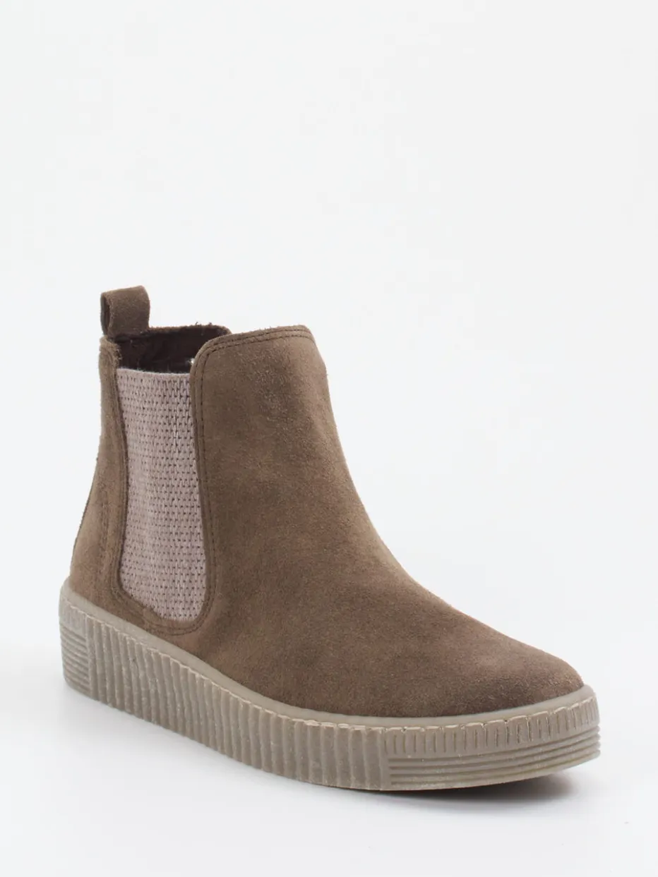 Urbaner Stil. Alltagskomfort mit Charakter.Gabor zeigt mit diesen Chelsea Boots eine stilsichere Damen-Stiefelette für die Herbst-Winter-Saison. Wenn es morgens schnell gehen muss, überzeugt die Schlupfform mit tonigen Elastikeinsätzen und rückseitiger Zuglasche. Das taupebraune Veloursleder verleiht dem Modell eine matte, besonders weiche Haptik. Knöchelhoch geschnitten und rund zulaufend, bildet die strukturierte Gummisohle mit feinem Profil ein griffiges Fundament – ideal für City und Büro. Dezente Färbung und klare Linien prägen den minimalistischen Look im Tonal-Dressing-Trend. Kombiniert mit High-Waist Jeans und Strick wird der Stil komplett. Ein Gabor-Schuh, der Funktionalität mit lässiger Ästhetik verbindet.