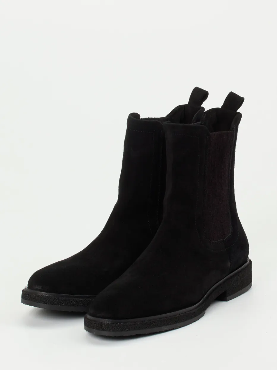 Die Chelsea Boots von Andrea Puccini überzeugen mit klassischer Silhouette, schwarzem Veloursleder und feinem Minimalismus – perfekt für Urban Looks mit Understatement.