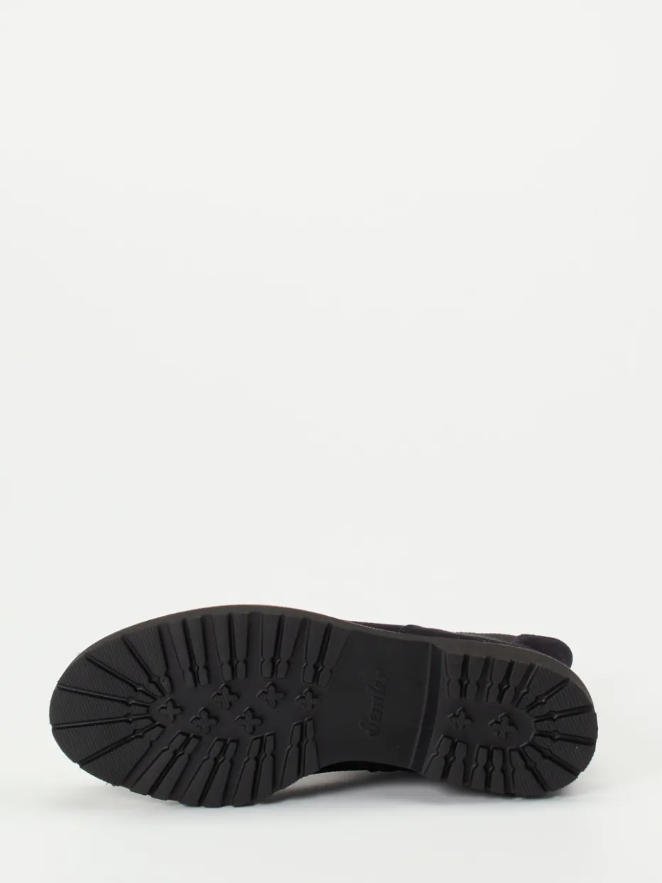 Ideal für kühle Herbsttage im urbanen Alltag: Die tiefdunkelblauen Boots bestehen aus hochwertigem, samtig-mattem Veloursleder mit seitlichem Elastikeinsatz und innenliegendem Reißverschluss. Die knöchelhohe Silhouette wird durch eine helle Kontrastnaht akzentuiert. Die schwarze Leichtzellsohle mit griffigem Profil bietet Trittsicherheit und unterstreicht den minimalistischen Utility-Charakter. Der Look passt perfekt zu Kaschmir-Mantel oder Leder-Shopper.