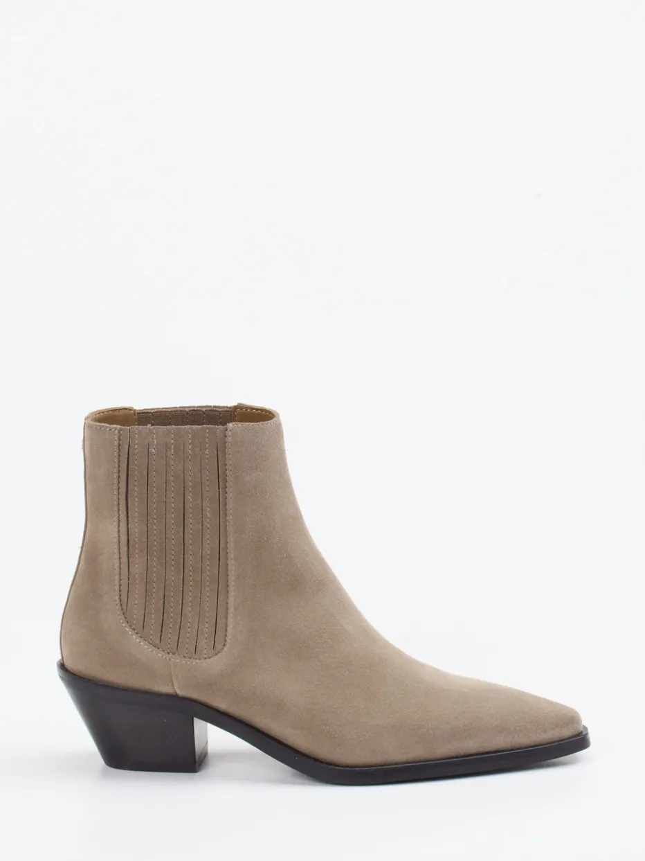 Die elegante Chelsea-Stiefelette von Boss kombiniert hochwertiges Veloursleder in Taupe mit einer spitz zulaufenden Form und westlich inspiriertem Minimalismus – ideal für stilvolle Everyday- und Business-Looks.