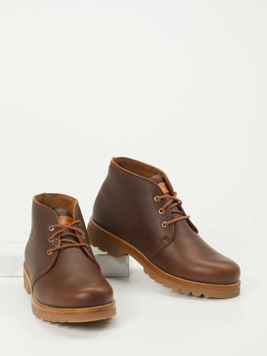 Robuste Eleganz neu interpretiert.Panama Jack präsentiert Herren-Schnürboots der Kategorie Chukka – funktional designt für Alltag und Outdoor. Ob City-Walk oder Waldspaziergang: Das mittelbraune Fettleder mit genarbter Oberfläche ist nicht nur authentisch im Look, sondern auch wasserabweisend und strapazierfähig. Kupferfarbene Metallösen, tonige Leder-Schnürsenkel und das seitlich eingeprägte Markenlogo unterstreichen die Heritage-Ästhetik. Dank wärmendem Innenfutter aus Lammfell und weich gepolstertem Schaft bleibt der Komfort nicht auf der Strecke. Die durchgenähte Gummisohle in Holzoptik mit starkem Profil garantiert sicheren Halt – auch bei Nässe. Besonders stimmig zu Outdoorjacke oder Wollcardigan. Hochfunktionale Winterboots mit klarer Formensprache und kernigem Stilanspruch.