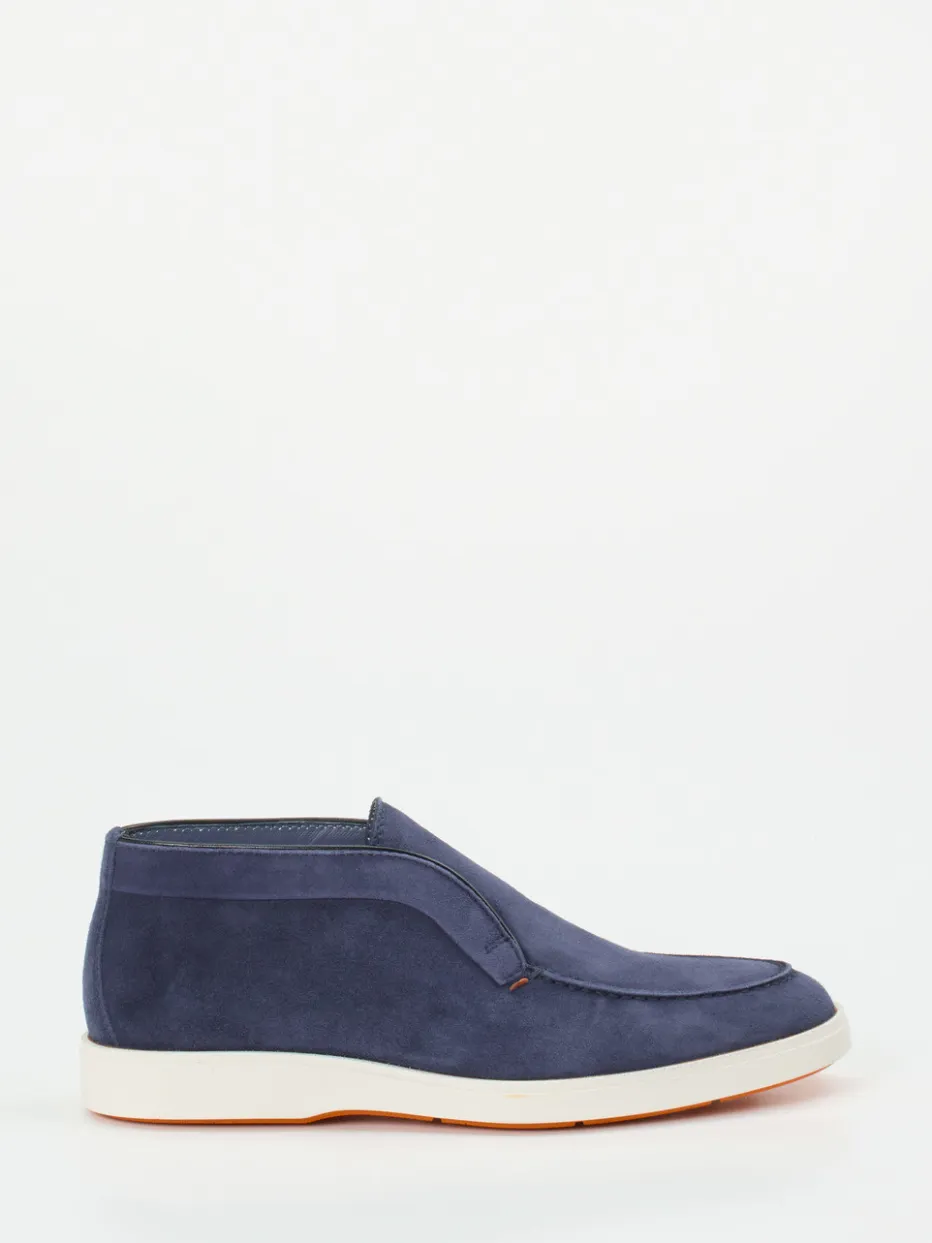 Hochwertiges Veloursleder, eine klare Formsprache und eine kontrastierende Laufsohle definieren diesen modernen Slip-On aus dem Hause Santoni.