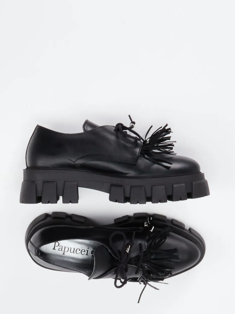 Dieser Papucei-Schnürschuh kombiniert hochwertiges Kalbleder mit progressivem Design. Die markante Profilsohle und silberakzentuierte Fransen sorgen für ein expressives Statement.