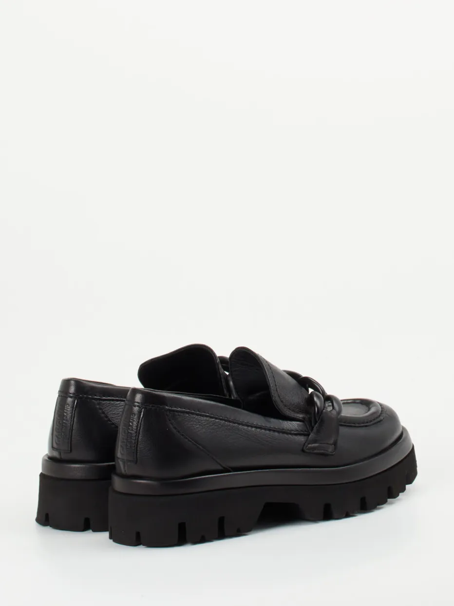 Modernes Understatement für urbane Looks.Donna Carolina präsentiert einen stilvollen Damen-Loafer mit betont klarem Design. Ideal für den Einsatz im Büro oder bei City-Streifzügen kombiniert dieses Modell weiches schwarzes Kalbleder mit einer matt anmutenden Oberfläche. Die klassisch inspirierte Silhouette ruht auf einer breiten, tief profilierten Leichtzellsohle – ein Streetstyle-Update mit Komfortfaktor. Blickfang ist das hochwertige Kettendetail aus Kunststoff in Ton-in-Ton-Optik. Der bequeme Schlupfschuh ist alltagstauglich und zugleich der perfekte Begleiter für monochrome Looks und minimalistische Outfits. Ein souveräner Auftritt mit wertiger Verarbeitung und designstarkem Finish.
