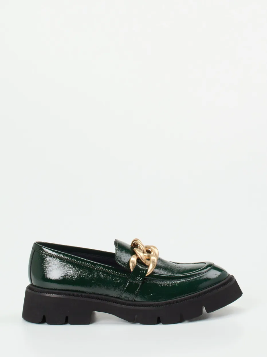 Glänzendes tannengrünes Lackleder trifft auf eine markante Profilsohle und zeitgemäße Kettendetails – dieser Loafer interpretiert den Chunky-Trend auf edle Weise.