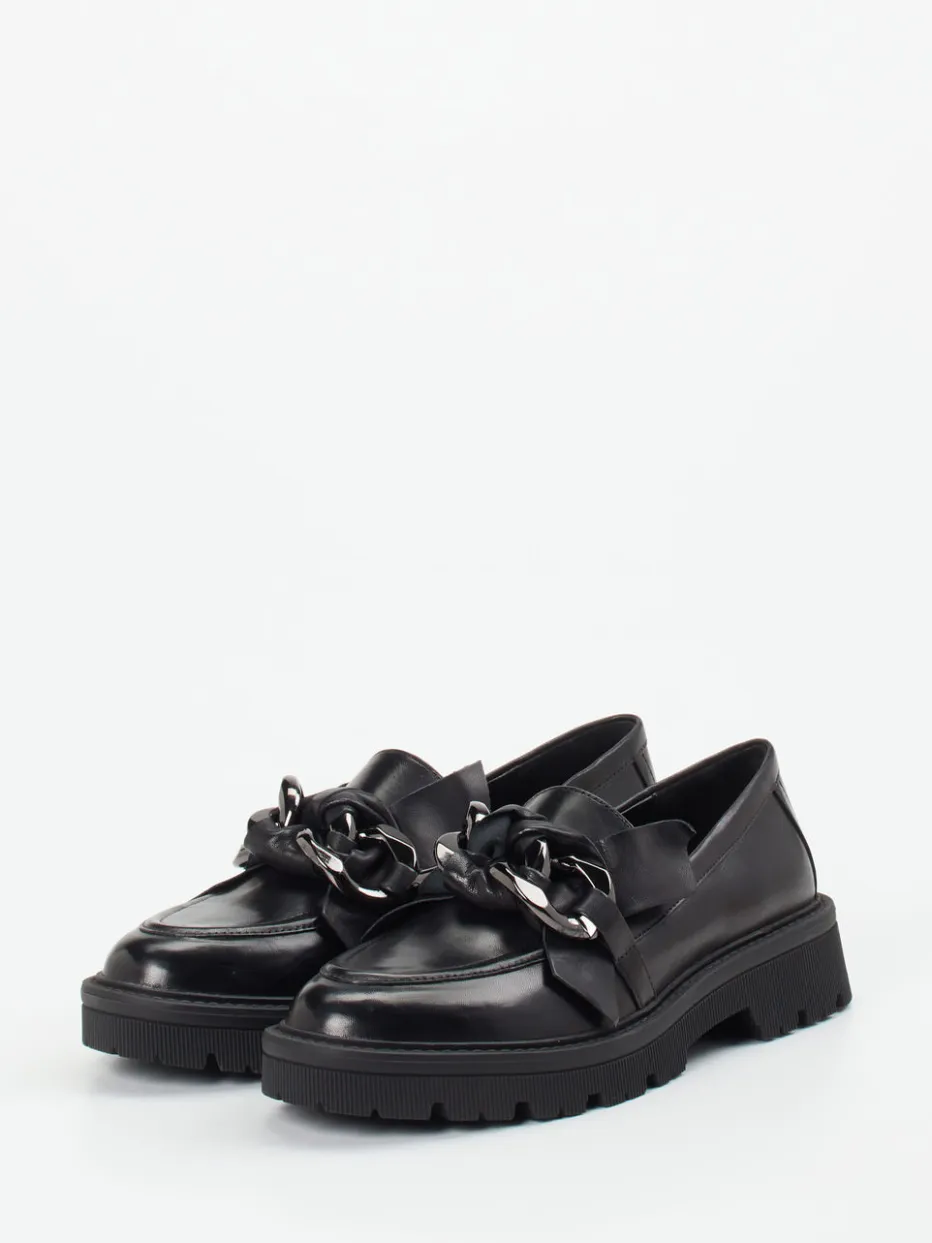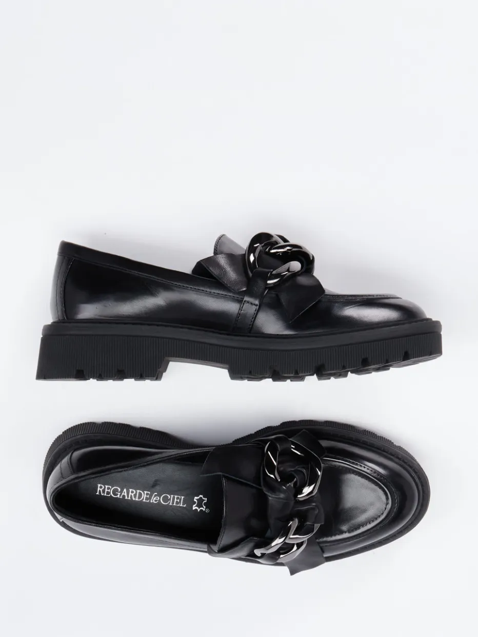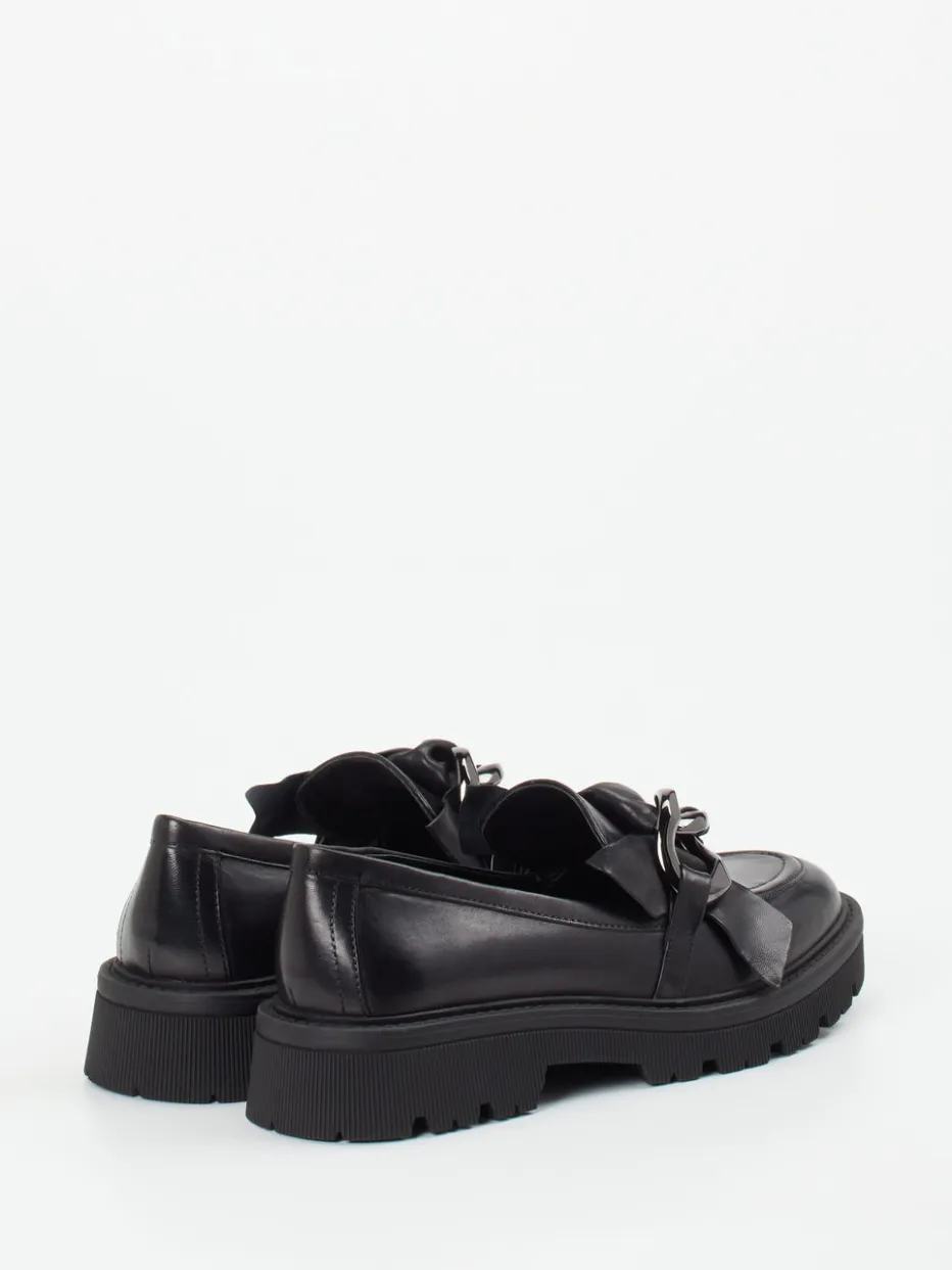 Der schwarze Loafer kombiniert edles, leicht glänzendes Lammleder mit auffälligem Kettendetail. Die breite Profilsohle unterstreicht den trendbewussten Auftritt.